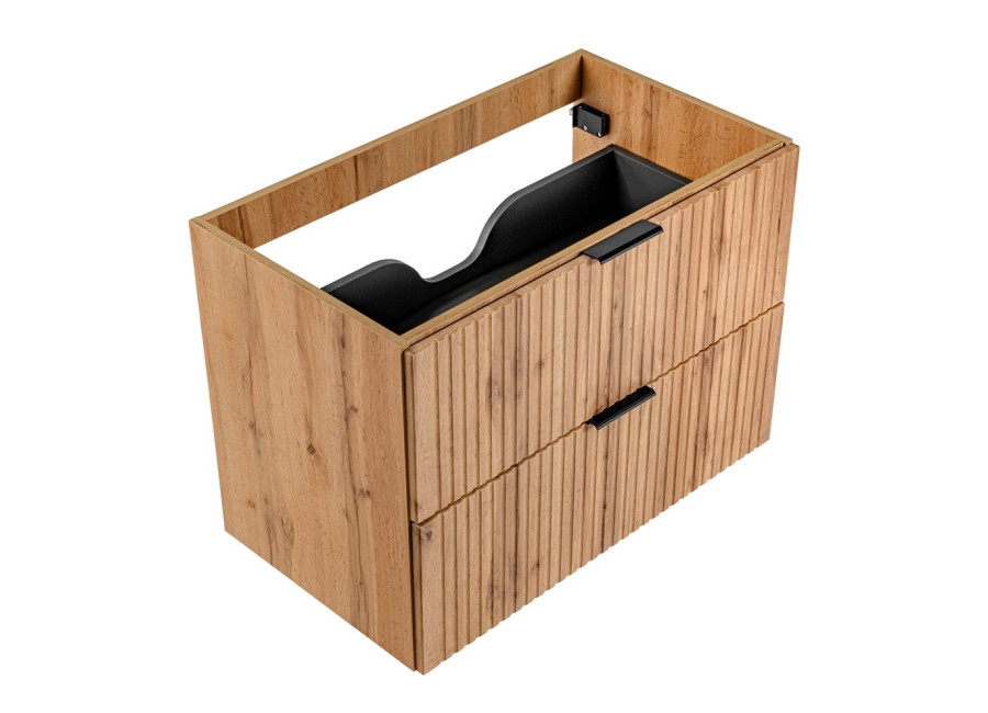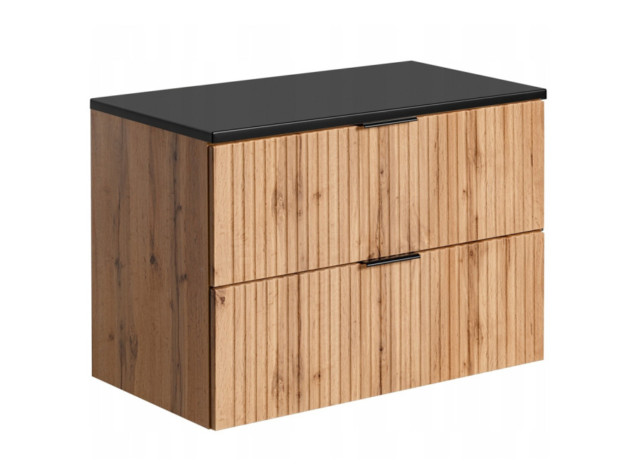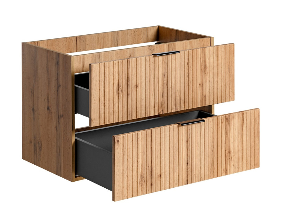 Skrinka pod umývadlo s doskou v šírke 80 cm ADEL dub 82-80-B-2D-DC patrí medzi kúpeľňový nábytok, ktorý kombinuje praktickosť a moderný vzhľad. Vyrobená je z kvalitnej laminovanej drevotriesky s ABS hranami a dvierkami z MDF materiálu, čo zaručuje jej odolnosť voči vlhkosti. Skrinka sa pýši elegantným zvislým drážkovaním na čielkach zásuviek a farebným prevedením dub wotan, pričom vnútro zásuviek je ladené do sivej farby. Je určená na zavesenie na stenu a obsahuje dve zásuvky vybavené funkciou tichého dovierania.