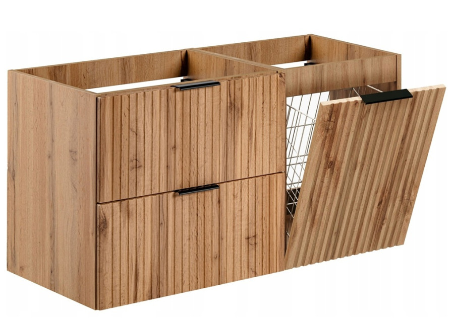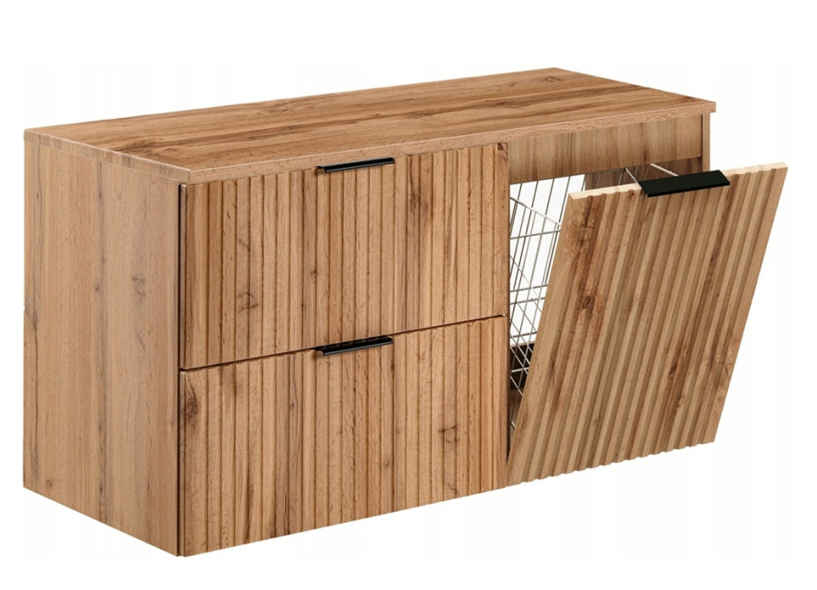 Skrinka pod umývadlo 100 cm ADEL predstavuje spoľahlivý kúpeľňový nábytok, ktorý je vhodný do všetkých konceptov kúpeľní. Kúpeľňová skrinka v šírke 100 cm sa skladá zo 60 cm zásuvkovej skrinky, 40 cm skrinky s košom na prádlo a 100 cm vrchnej dosky. Je vyrobená z kvalitnej laminovanej drevotriesky s ABS hranami, čielka zásuviek z MDF materiálu odolnému voči vlhkosti. Farebné prevedenie dub wotan dodáva prirodzený vzhľad a vnútorné časti zásuviek sú v sivej farbe.