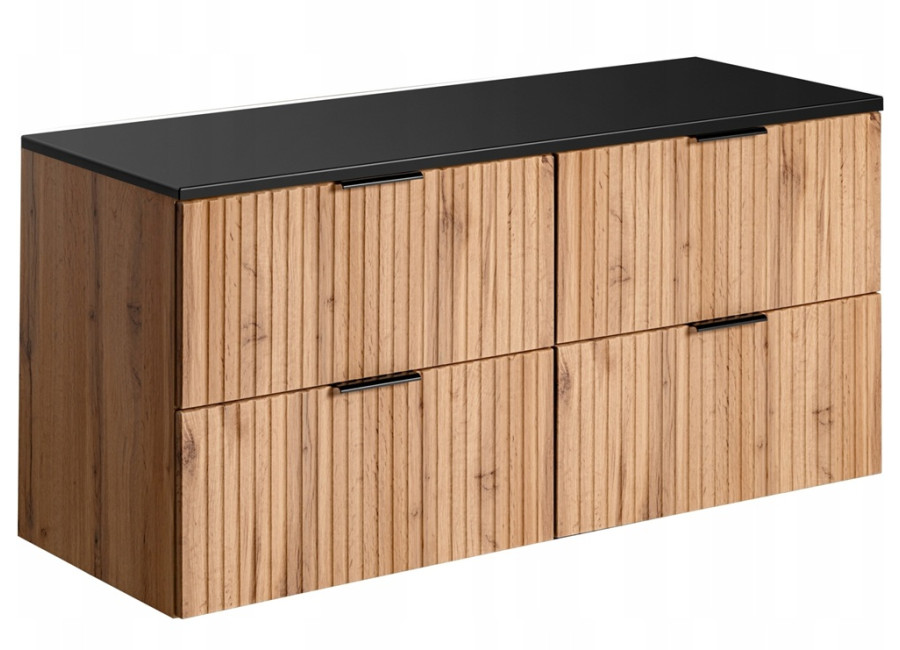 Skrinka pod umývadlo s doskou ADEL vo farbe dub wotan predstavuje funkčný a estetický prvok moderného kúpeľňového nábytku. Kúpeľňová skrinka v šírke 120 cm je zložená z dvoch 60 cm skriniek a 120 cm čiernej vrchnej dosky, čím poskytuje veľkorysý úložný priestor a zároveň umožňuje flexibilné riešenia pre umiestnenie jedného alebo dvoch umývadiel. Korpus je vyrobený z kvalitnej laminovanej drevotriesky s ABS hranami, ktoré zvyšujú odolnosť voči mechanickému poškodeniu a vlhkosti. Čielka zásuviek z MDF materiálu odolnému voči vlhkosti sú zárukou dlhej životnosti aj v kúpeľňovom prostredí. Farebné prevedenie dub wotan vnáša do interiéru teplý prírodný akcent, zatiaľ čo vnútorné časti zásuviek sú v sivej farbe. Moderne zdobené čielka zásuviek dodávajú skrinke elegantný vzhľad.