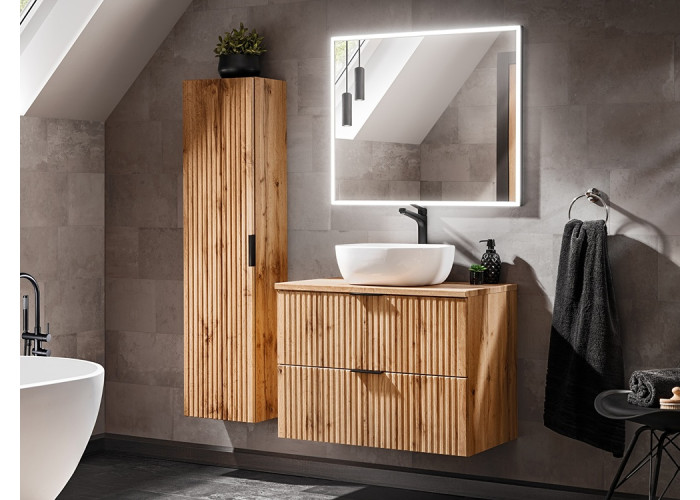 Predstavujeme Vám skrinku s umývadlom ADEL v dekore dub wotan, ktorá je praktickým doplnkom do malých kúpeľňových priestorov. Skrinka s umývadlom v šírke 40 cm je vyrobená z kvalitnej laminovanej drevotriesky s ABS hranami. Dvierka sú z MDF materiálu, ktorý je upravený tak, aby bol odolný voči vlhkosti. Farebné prevedenie dub wotan dodáva skrinke teplý a prírodný vzhľad, zatiaľ čo moderne zdobené dvierka prispievajú k jej elegantnému dizajnu. Skrinka je určená na zavesenie na stenu, čo uľahčuje údržbu podlahy a prispieva k vzdušnejšiemu vzhľadu kúpeľne. Pre individuálne prispôsobenie vášmu vkusu nájdete v balení tri sady úchytiek v čiernej, striebornej a zlatej farbe.