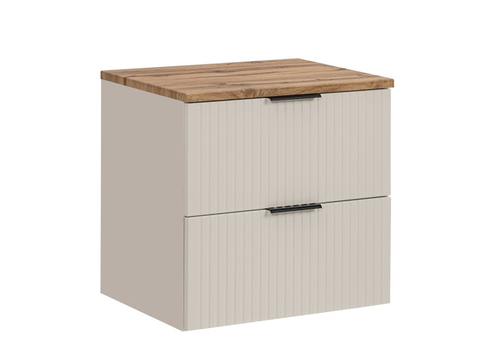 Hľadáte kvalitný a zároveň dizajnovo zaujímavý kúpeľňový nábytok? Skrinka pod umývadlo s doskou ADEL cashmere 82-60-2S-DW predstavuje ideálnu voľbu pre tých, ktorí ocenia elegantné spracovanie a moderný vzhľad. Skrinka pod umývadlo v šírke 60 cm je navrhnutá tak, aby poskytla dostatok úložného priestoru a zároveň elegantne doplnila interiér Vašej kúpeľne. Korpus skrinky je vyrobený z kvalitnej laminovanej drevotriesky s ABS hranami, čo zaručuje jej dlhú životnosť aj vo vlhkom prostredí kúpeľne. Čielka zásuviek, zhotovené z MDF materiálu, zaujmú na prvý pohľad svojím zvislým ozdobným drážkovaním, ktoré dodáva skrinke jedinečný charakter. Celkový dojem podčiarkuje farebné prevedenie kašmír (béžová) s vrchnou doskou vo farbe dub wotan.