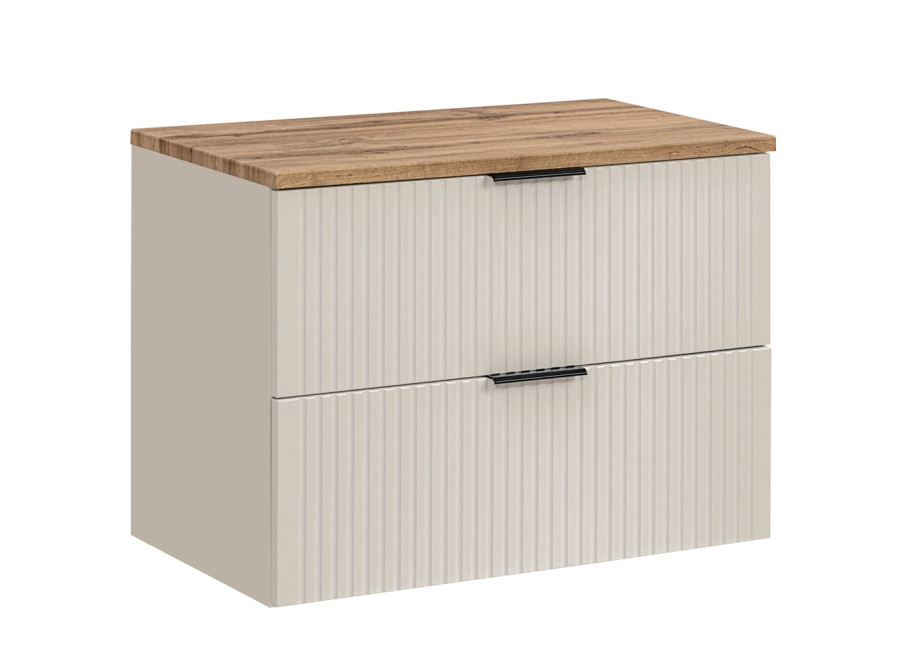 Skrinka pod umývadlo s vrchnou doskou v šírke 80 cm z kolekcie ADEL predstavuje praktické riešenie pre moderný kúpeľňový interiér. Kúpeľňový nábytok je vyrobený z kvalitnej laminovanej drevotriesky s ABS hranami. Čielka zásuviek sú z MDF materiálu, pričom ich zdobí zvislé moderné drážkovanie. Skrinka sa ponúka vo farebnom prevedení kašmír (béžová) + dub wotan, čo zaručí vkusné a ľahko kombinovateľné začlenenie do rôznych kúpeľňových priestorov. Súčasťou balenia sú tri farebné sady úchytiek – čierna matná, lesklá zlatá a lesklá chrómová. Úchytky si môžete zladiť s batériou alebo inými kúpeľňovými doplnkami podľa vlastných preferencií a štýlu Vašej kúpeľne.