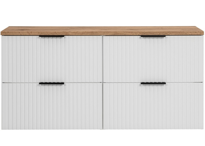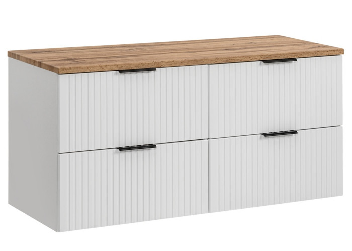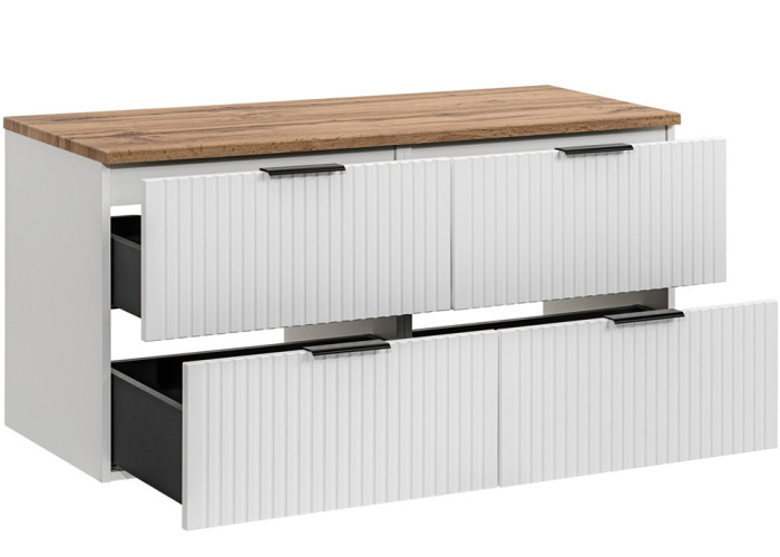 Praktická skrinka pod umývadlo v šírke 120 cm predstavuje ideálne riešenie pre stredné až väčšie kúpeľne. Model ADEL white 82-120-4S-DW kombinuje moderný dizajn s funkčnosťou. Skrinka sa skladá z troch častí: zo 60 cm zásuvkovej skrinky v počte 2ks a 120 cm vrchnej dosky, čo umožňuje flexibilné usporiadanie úložného priestoru. Farebné prevedenie biela matná + dub wotan dodáva kúpeľni svieži vzhľad, ktorý sa hodí k rôznym štýlom zariadenia.
