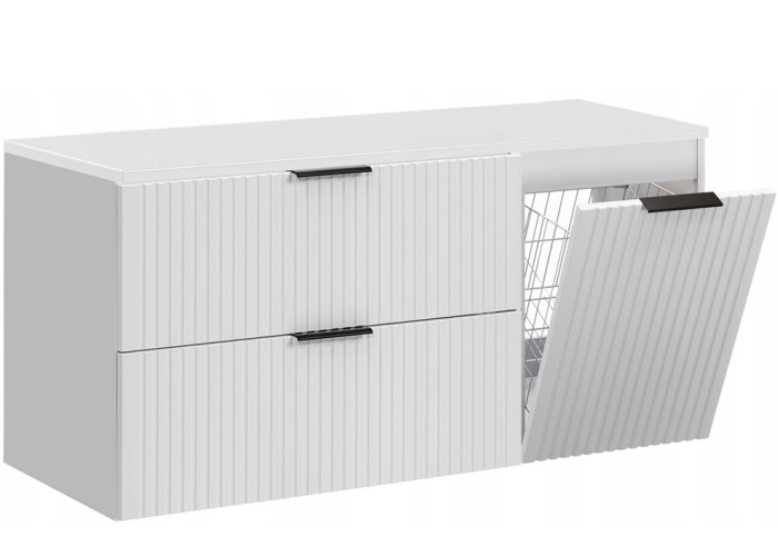 Čielka zásuviek majú zvislé ozdobné drážkovanie, ktoré dodáva celku výnimočný detail. Tri farebné sady úchytiek: čierna matná, lesklá zlatá a lesklá chrómová, umožňujú zladiť riešenie so zvyškom kúpeľňových doplnkov alebo batériou. Skrinka je určená na zavesenie na stenu, zásuvky sú vybavené funkciou tichého dovierania pre maximálny komfort pri každodennom používaní.