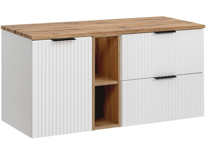 Kombinácia matnej bielej a dubu wotan prináša osviežujúci vzhľad, ktorý skvele zapadne do každého štýlu kúpeľňového zariadenia. Kúpeľňové skrinky série ADEL sú vyrábané z odolnej laminovanej drevotriesky s ABS hranami a čielkami z kvalitného MDF materiálu. To im zaručuje vysokú životnosť a spoľahlivú odolnosť voči vlhkosti. Zásuvky a dvierka sú ozdobené elegantným zvislým frézovaním, čo nábytku dodáva jemný a luxusný detail. K dispozícii sú dve priestranné zásuvky s funkciou tichého dovierania, ktoré bezpečne uschovajú kozmetiku, uteráky, čistiace prostriedky i všetky ďalšie dôležité drobnosti. Kôš na prádlo pojme špinavé oblečenie. Pre ideálne využitie hornej zásuvky odporúčame k skrinke pod umývadlo dokúpiť plochý sifón.