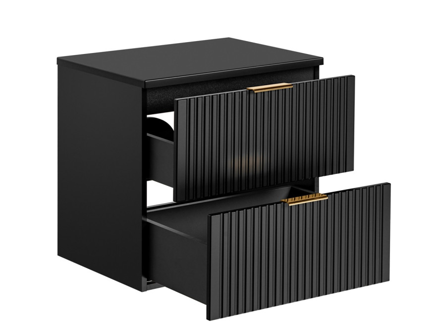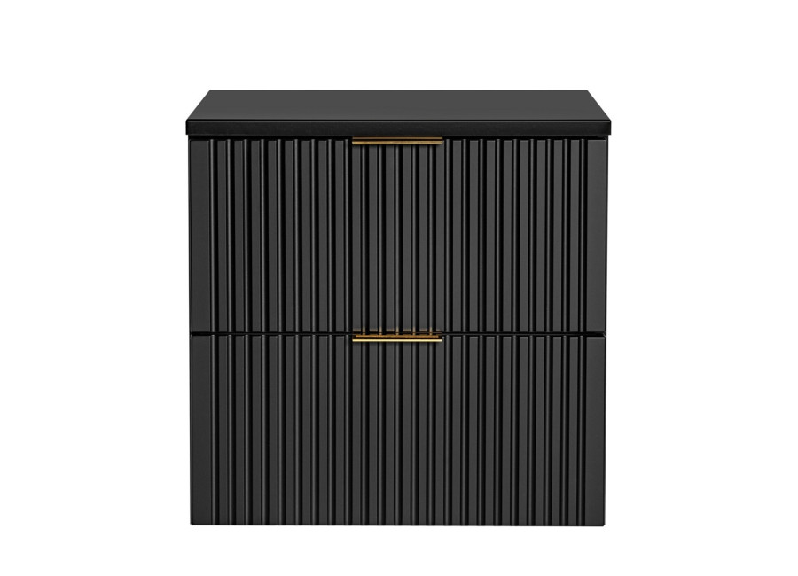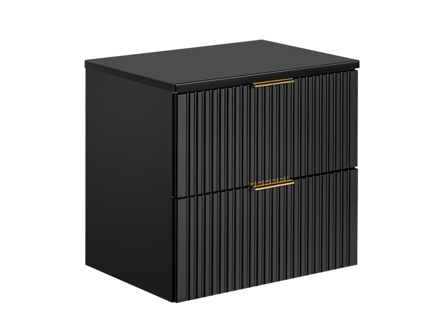 Skrinka pod umývadlo je vyrobená z laminovanej drevotriesky s ABS hranami, čo jej zabezpečuje zvýšenú odolnosť voči vlhkosti. Čelá zásuviek sú z MDF materiálu, ich povrch zdobí zvislé ozdobné drážkovanie, ktoré dodáva celému nábytku decentný vizuálny detail. Farebné prevedenie čierna matná pôsobí elegantne a ľahko sa kombinuje s ostatnými doplnkami v kúpeľni. Skrinka je vybavená dvoma zásuvkami s funkciou tichého zatvárania. Výhodou sú tri farebné sady plastových úchytiek – v balení nájdete čiernu matnú, lesklú zlatú aj lesklú chrómovú variantu. Úchytky si tak jednoducho zladíte s batériou alebo inými doplnkami vo vašej kúpeľni.