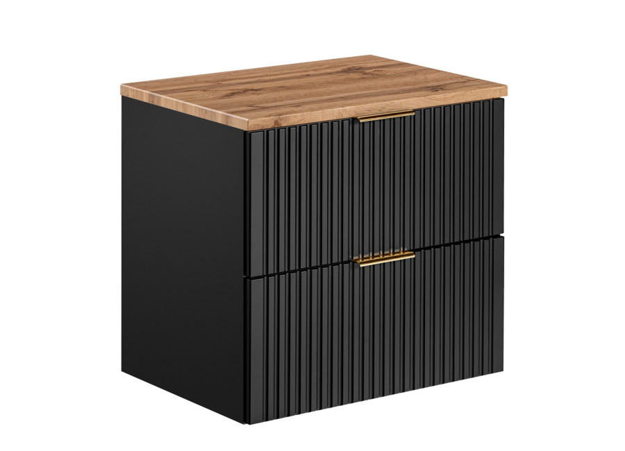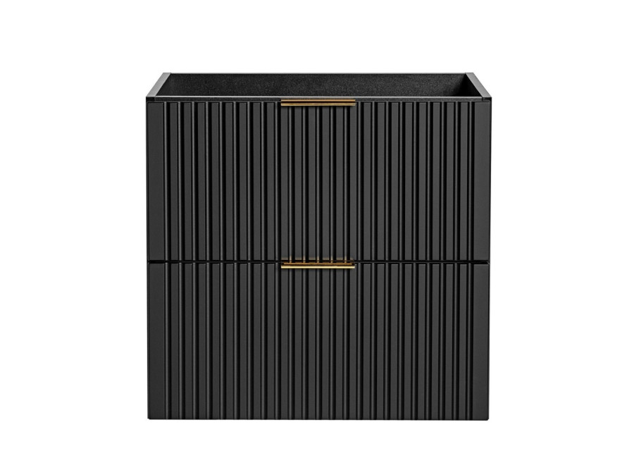 Skrinka pod umývadlo je vyrobená z laminovanej drevotriesky s ABS hranami, čo jej zabezpečuje zvýšenú odolnosť voči vlhkosti. Čelá zásuviek sú z MDF materiálu, ich povrch zdobí zvislé ozdobné drážkovanie, ktoré dodáva celému nábytku decentný vizuálny detail. Farebné prevedenie čierna matná pôsobí elegantne a ľahko sa kombinuje s ostatnými doplnkami v kúpeľni. Skrinka je vybavená dvoma zásuvkami s funkciou tichého zatvárania. Výhodou sú tri farebné sady plastových úchytiek – v balení nájdete čiernu matnú, lesklú zlatú aj lesklú chrómovú variantu. Úchytky si tak jednoducho zladíte s batériou alebo inými doplnkami vo vašej kúpeľni.