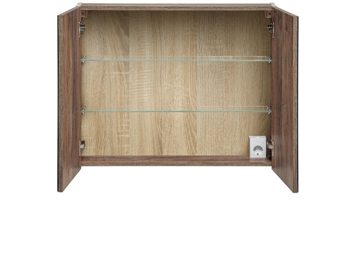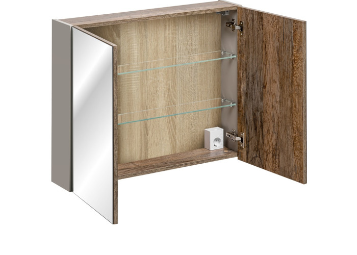 Skrinka so zrkadlom nad umývadlo SANTA FE Taupe 84-80-2D je kvalitný kúpeľňový nábytok, ktorý dokonale zapadne do kúpeľového prostredia. Skrinka v šírke 80 cm je vyrobená z kvalitnej laminovanej drevotriesky s ABS hranami. Farebné prevedenie dub vintage + taupe dodá vašej kúpeľni útulnú a elegantnú atmosféru. Je určená na zavesenie na stenu, čo umožňuje jednoduchú inštaláciu a maximálnu flexibilitu pri usporiadaní kúpeľňového priestoru. Dvierka sú vybavené funkciou tichého dovierania.