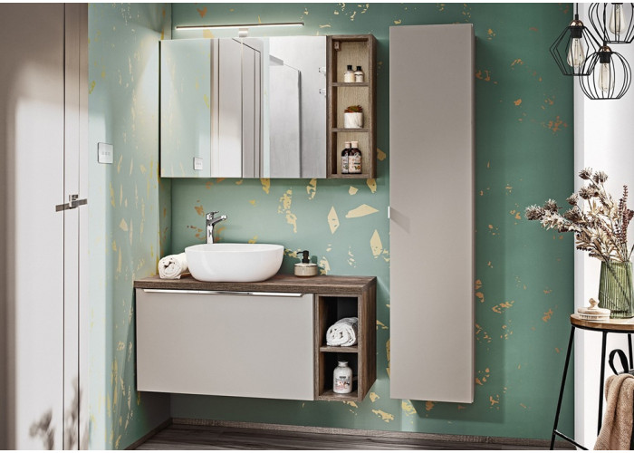 Kolekcia SANTA FE dub ponúka aj ďalší kúpeľňový nábytok, ako sú vysoké skrinky alebo závesné kúpeľňové skrinky, takže si môžete zostaviť plne funkčný a štýlový interiér presne podľa svojich potrieb.