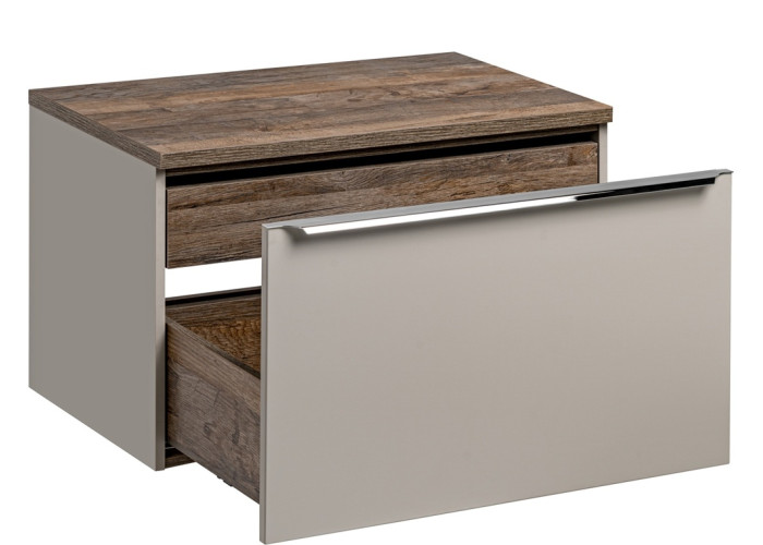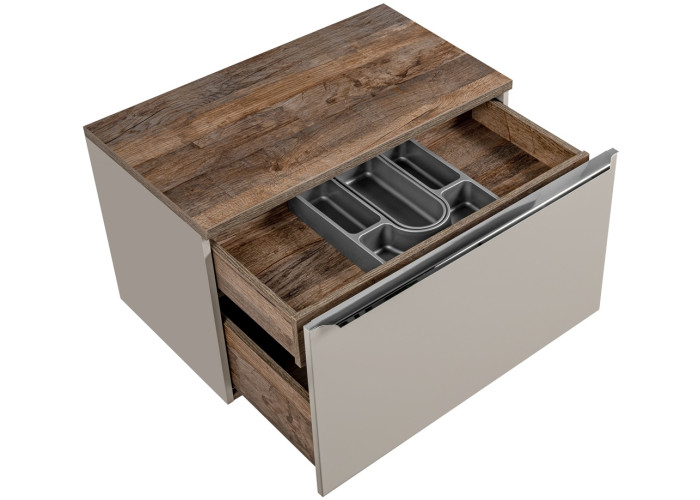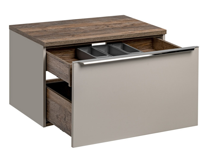Skrinka je vybavená dvoma praktickými zásuvkami, ktoré poskytujú dostatok úložného priestoru na hygienické potreby, kozmetiku či iné predmety potrebné na každodenné používanie. Obidve zásuvky sú vybavené funkciou tichého zatvárania. Horná zásuvka obsahuje organizér, ktorý nielenže zakrýva otvor pre sifón, ale aj vytvára dodatočný odkladací priestor na menšie predmety, ako sú kefky, holiace potreby alebo kozmetiku. Táto funkcia je obzvlášť užitočná v prípade, že skrinku využívate bez umývadla.