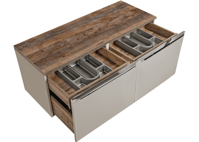 Kúpeľňová skrinka sa skladá z dvoch 60 cm skriniek, obsahuje štyri zásuvky, ktoré sú navrhnuté tak, aby poskytovali množstvo úložného priestoru pre rôzne hygienické potreby, kozmetiku či kúpeľňové doplnky. Každá zásuvka je vybavená mechanizmom tichého zatvárania, ktorý zaručuje pohodlné a nehlučné používanie. Na zefektívnenie úložného priestoru sme do hornej zásuvky pridali organizér, ktorý zakrýva výrez na sifón a zároveň poskytuje dodatočný úložný priestor, čo je veľmi praktické najmä v prípade, ak sa rozhodnete využiť skrinku bez umývadla.