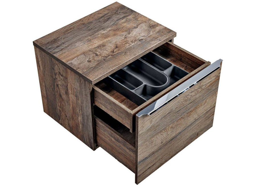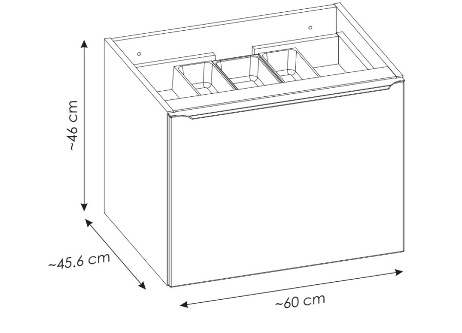 Kúpeľňová skrinka je navrhnutá na zavesenie na stenu, čo uľahčuje údržbu podlahy v kúpeľni. Skrinka obsahuje dve zásuvky s funkciou tichého zatvárania. Dôležitým prvkom je organizér v hornej zásuvke. Je navrhnutý tak, aby zakryl výrez na sifón a zároveň poskytol dodatočný odkladací priestor. Tento praktický detail oceníte najmä v prípade, ak plánujete skrinku využiť bez inštalácie umývadla. Ku skrinke je potrebné zakúpiť sifón a umývadlo.