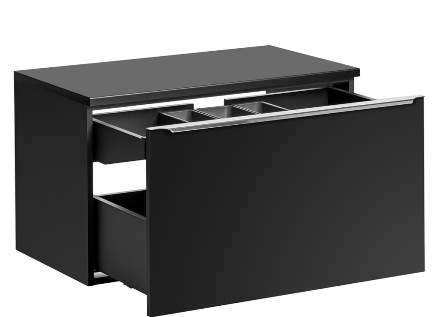 Vnútorné usporiadanie zahŕňa dve priestranné zásuvky, ktoré sú vybavené funkciou tichého dovierania. V hornej zásuvke sa nachádza praktický organizér, ktorý účinne zakrýva výrez na sifón a ponúka ďalší odkladací priestor, čo oceníte, ak sa rozhodnete skrinku využívať bez umývadla.