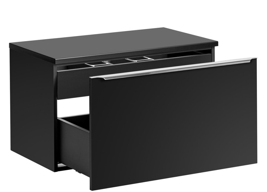 Skrinka pod umývadlo s doskou SANTA FE Black 82-80-2S-DC je skvelou voľbou pre všetkých, ktorí hľadajú moderný a funkčný kúpeľňový nábytok. Čierna skrinka pod umývadlo v šírke 80 cm je vyrobená z kvalitnej laminovanej drevotriesky s ABS hranami, čo jej zaručuje vysokú odolnosť voči vlhkosti. Hladké predné plochy, doplnené o chrómové úchytky a elegantné farebné prevedenie čierna matná, dokonale zapadnú do moderného štýlu kúpeľne.