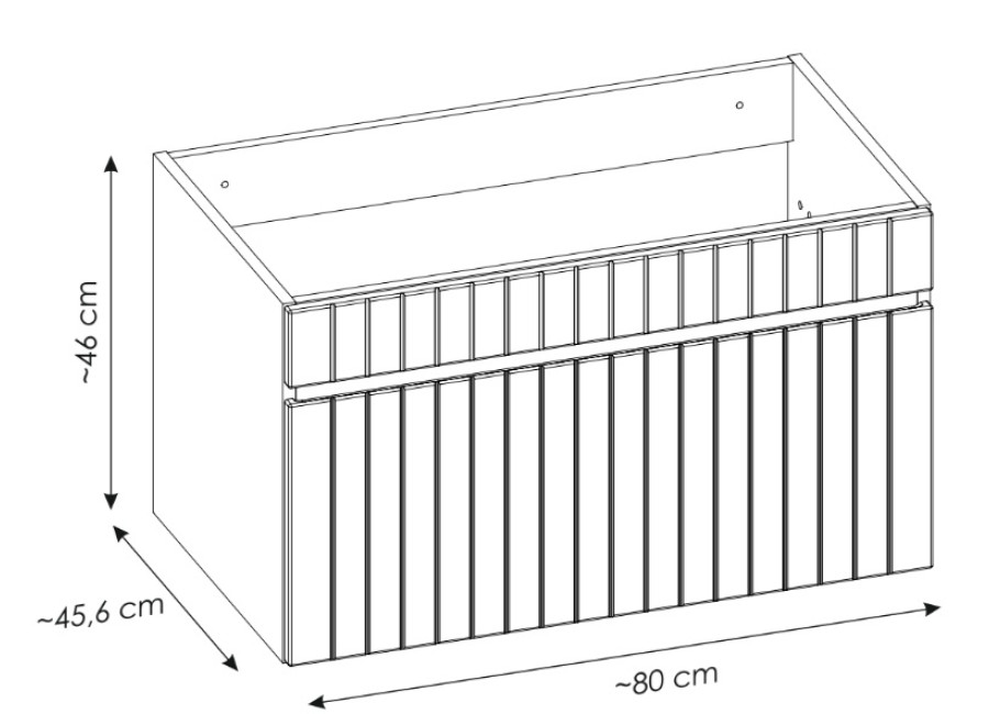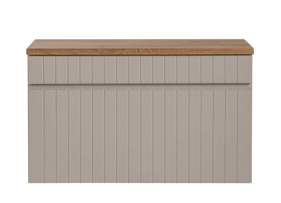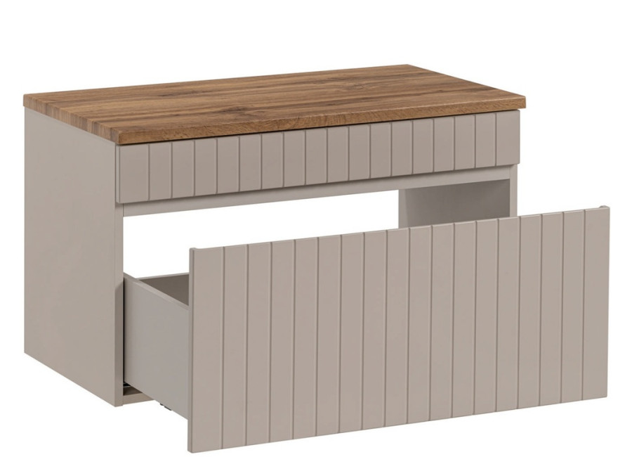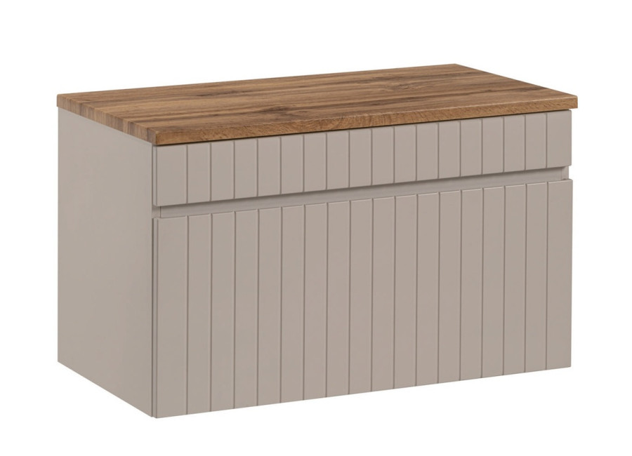 Skrinka pod umývadlo s doskou ICONIC Cashmere 82-80-D-1S-DE ponúka spojenie moderného dizajnu s praktickosťou, čo z nej robí ideálnu voľbu pre akúkoľvek kúpeľňu. Kúpeľňová skrinka v šírke 80 cm poskytuje dostatok úložného priestoru pre uloženie čistiacich prostriedkov, kozmetiky či iných kúpeľňových potrieb. Skrinka do kúpeľne je vyrobená z kvalitnej laminovanej drevotriesky s ABS hranami, pre lepšiu odolnosť proti vlhkosti. MDF čielko zásuvky je zdobené zvislými drážkami, ktoré dodávajú nábytku jemný estetický prvok. Minimalistická zafrézovaná úchytka umocňuje čistý a moderný vzhľad kúpeľňového nábytku.