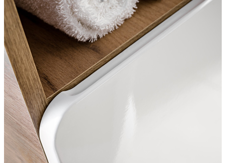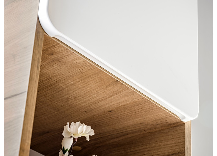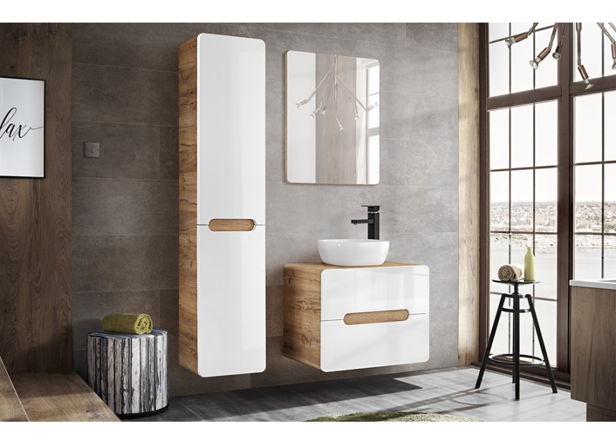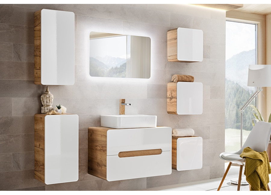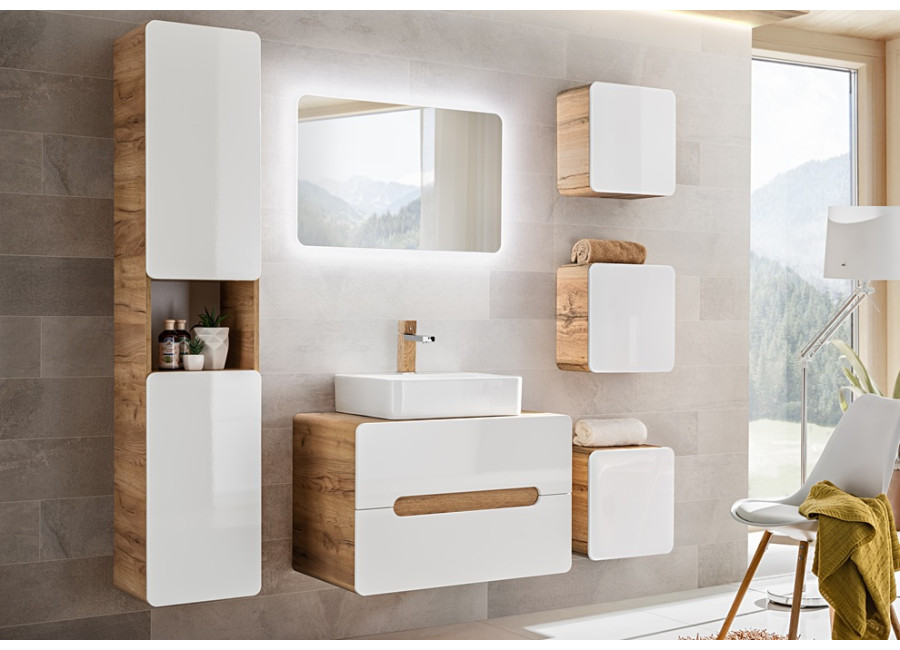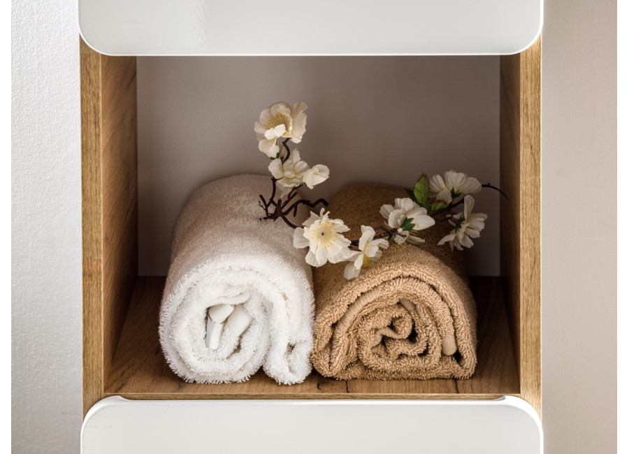 Zafrézovaná úchytka dodáva skrinke elegantný a minimalistický štýl, ktorý je zdôraznený farebným prevedením v kombinácii dub craft zlatého a bieleho lesku. Skrinka je určená na zavesenie na stenu, umožňuje efektívne využitie priestoru a jednoduchý prístup ku kúpeľňovým veciam.