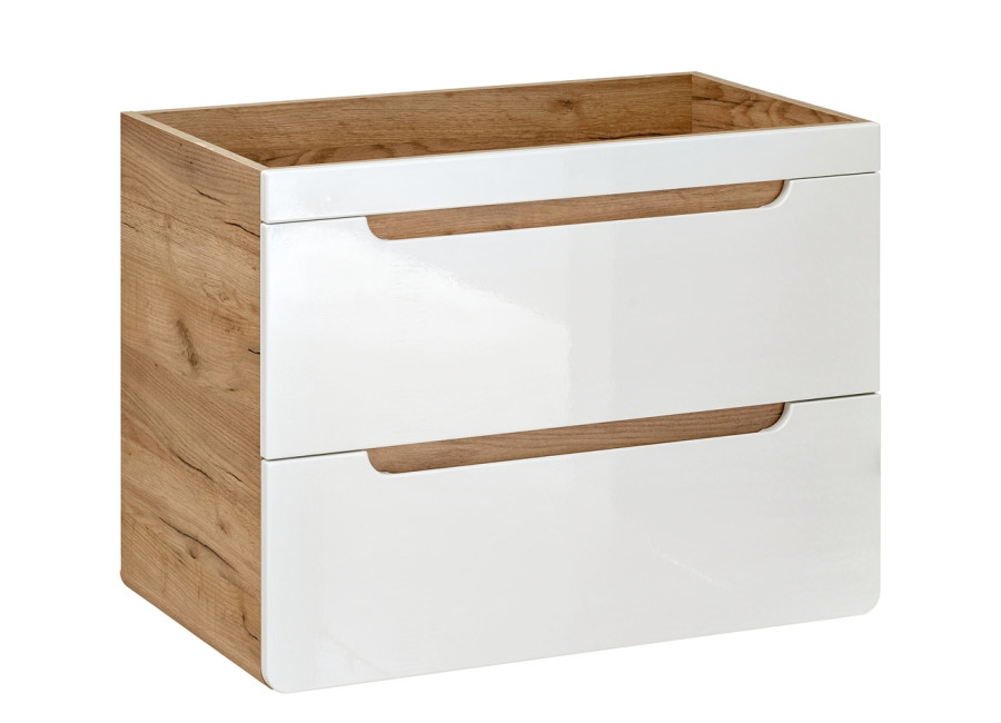 Farebné prevedenie kombinuje dub craft zlatý s bielym leskom. Je určená na zavesenie na stenu, nielenže šetrí miesto, ale aj umožňuje jednoduchšiu údržbu priestoru pod ňou. Dve zásuvky vybavené funkciou tichého zatvárania zvyšujú komfort používania.