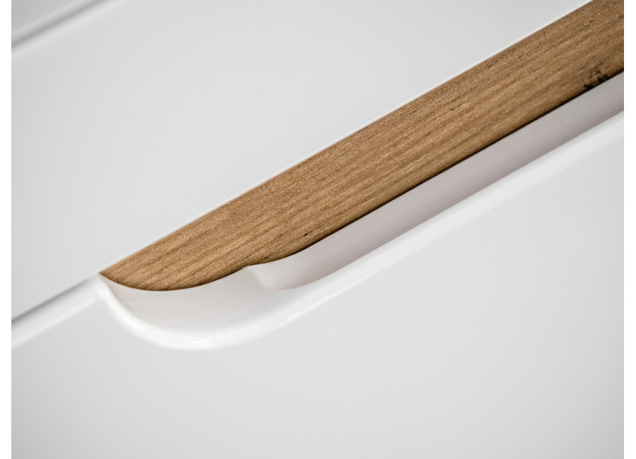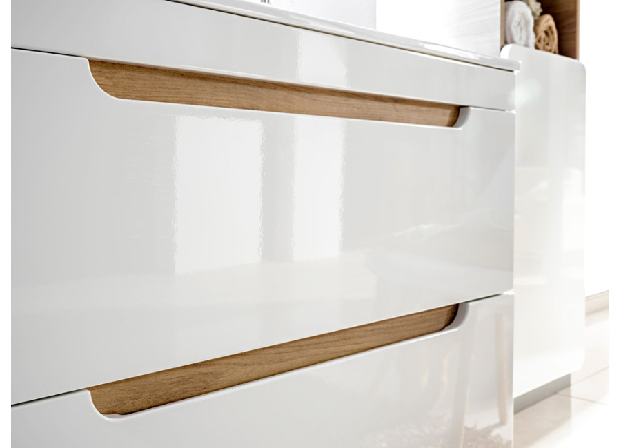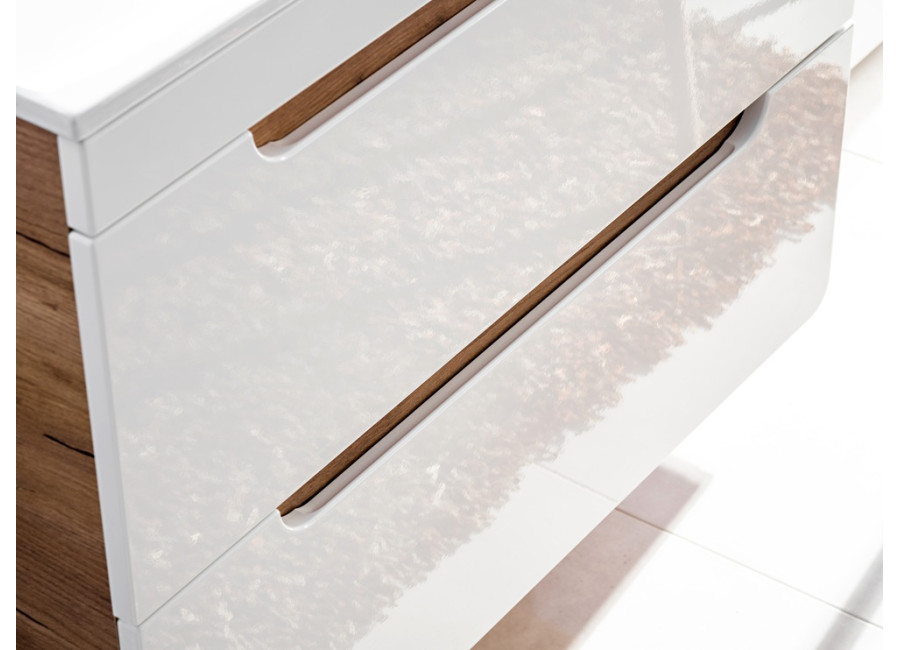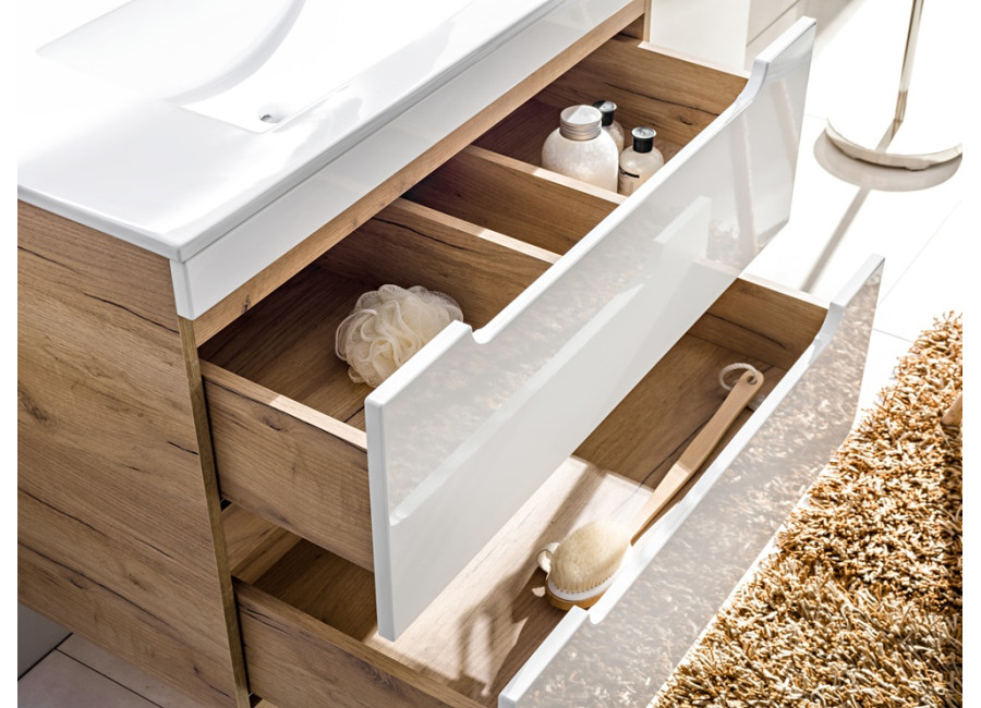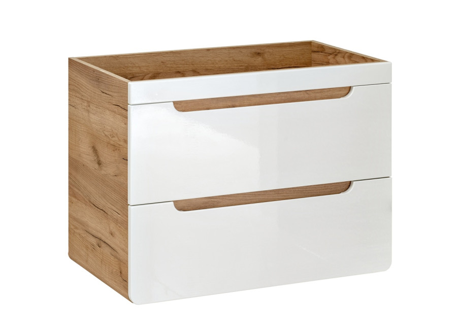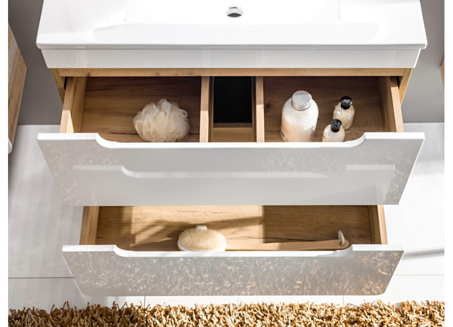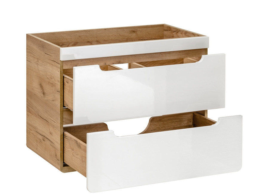Zafrézované úchytky zabezpečujú minimalistický dizajn, pričom farebné prevedenie dub craft zlatý v kombinácii s bielym leskom prináša elegantnosť do každého kúpeľňového prostredia. Skrinka je určená na zavesenie na stenu, čo zefektívňuje využitie priestoru a uľahčuje čistenie podlahy. Dve zásuvky vybavené funkciou tichého zatvárania prispievajú k pohodlnému používaniu.