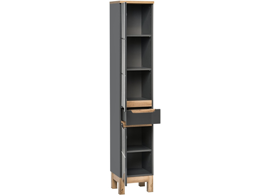 Vysoká policová skrinka do kúpeľne BALI grafit 800 je ideálnym doplnkom pre každú modernú aj klasickú kúpeľňu. Svojou šírkou 35 cm poskytuje dostatok úložného priestoru na všetky vaše potreby. Vyrobená je z laminovanej drevotriesky s ABS hranami, ktoré zaručujú odolnosť voči vlhkosti. Dvierka z MDF materiálu sú zdobené jednoduchým vodorovným ozdobným pásikom. Zafrézovaná úchytka v dvierkach a zásuvkách podčiarkuje ich moderný a minimalistický dizajn.