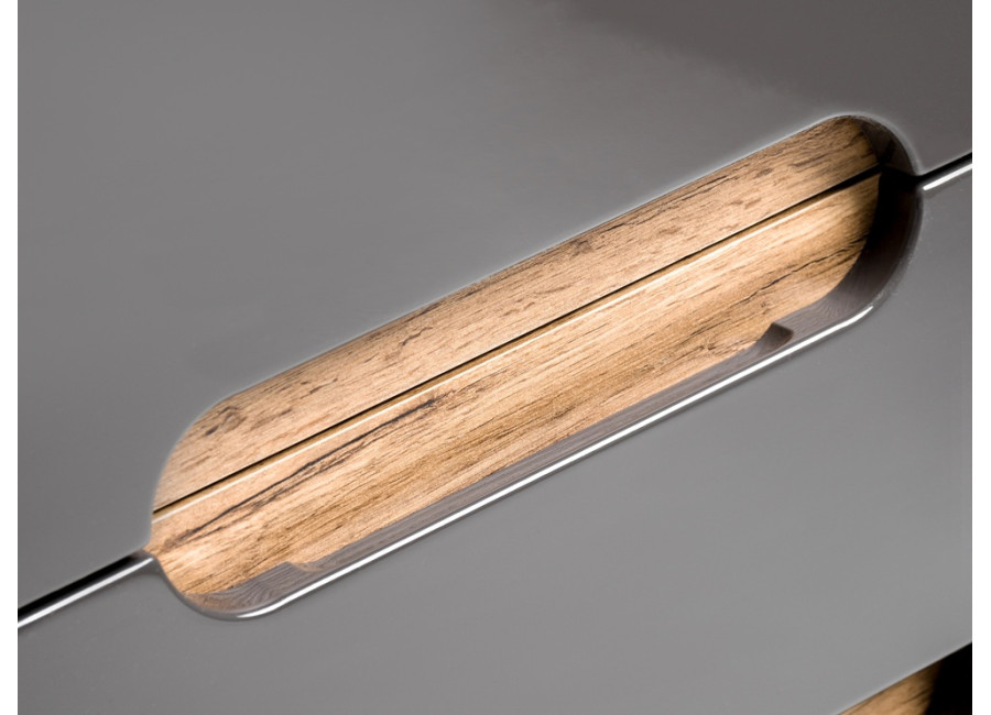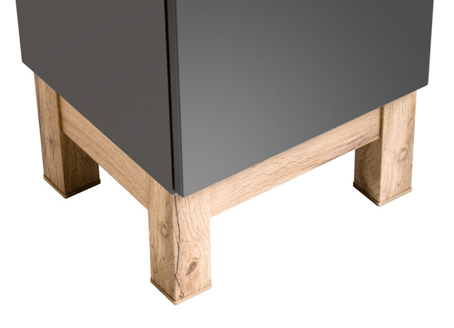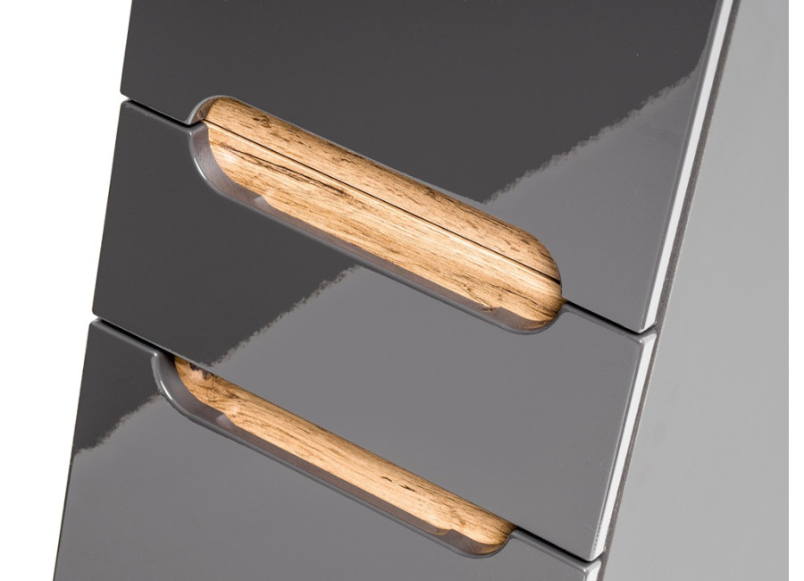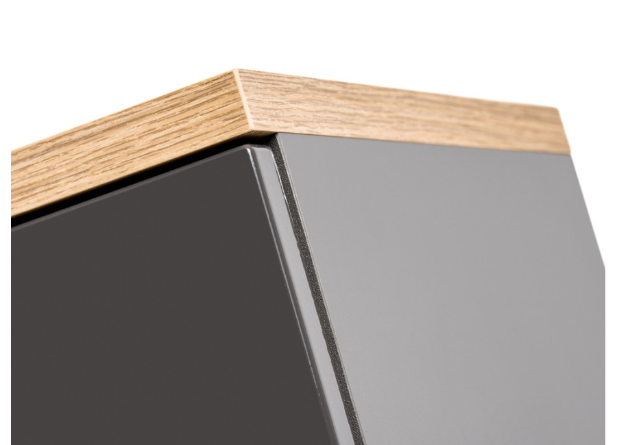 Farebná kombinácia sivá, dub wotan a sivý lesk je harmonická a elegantne zapadne do rôznych interiérov. Skrinka stojí na nožičkách, je vybavená mechanizmom na tiché dovieranie dvierok a zásuviek, čo prispieva k plynulému a nehlučnému chodu.