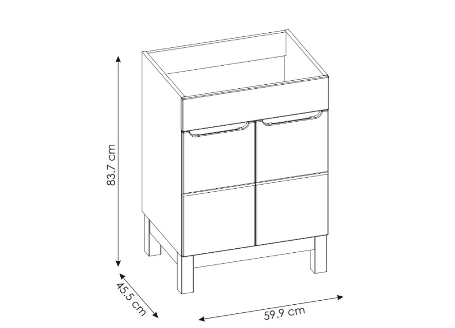 Dvoje dvierka sú vybavené funkciou tichého zatvárania, ktorá prispieva k pohodlnému a nehlučnému používaniu. Ku skrinke pod umývadlo odporúčame zakúpiť plochý sifón, ktorý umožní maximálne využitie hornej police. Vrchná doska nie je zahrnutá v cene skrinky, rovnako ako ani umývadlo. Toto Vám však ponúka možnosť výberu podľa vlastných preferencií, či už ide o zápustné umývadlo s rozmermi 60x46 cm, alebo vrchnú dosku s vrchným umývadlom.