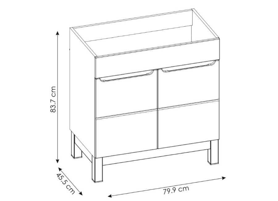 Dvoje dvierka sú vybavené funkciou tichého zatvárania, ktorá prispieva k pohodlnému a nehlučnému používaniu. Ku skrinke pod umývadlo odporúčame zakúpiť plochý sifón, ktorý umožní maximálne využitie hornej police. Vrchná doska nie je zahrnutá v cene skrinky, rovnako ako ani umývadlo. Toto Vám však ponúka možnosť výberu podľa vlastných preferencií, či už ide o zápustné umývadlo s rozmermi 80x46 cm, alebo vrchnú dosku s vrchným umývadlom.