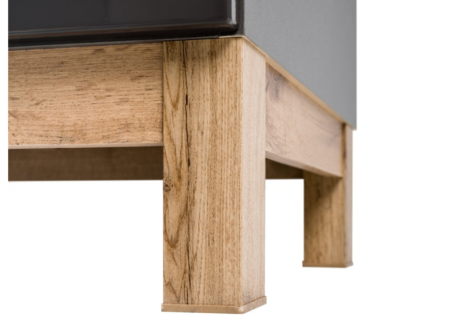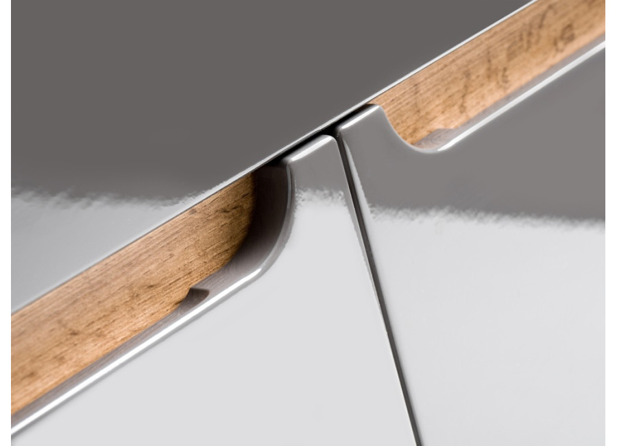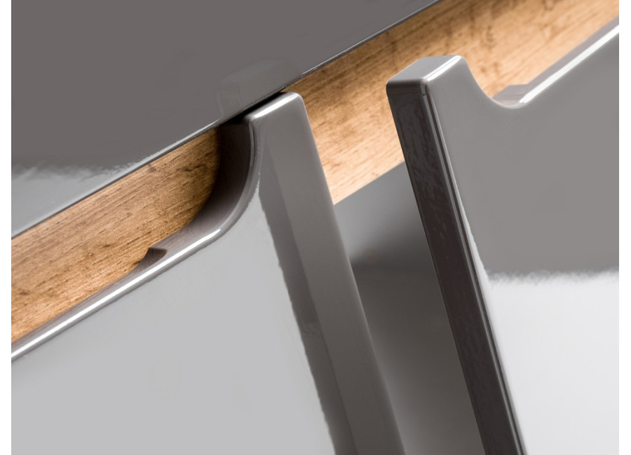 Vyrobená je z kvalitnej laminovanej drevotriesky s ABS hranami, ktoré zaisťujú odolnosť voči vlhkosti. Dvierka z MDF materiálu sú zdobené pásikom, ktorý pridáva na elegancii, pričom zafrézované úchytky podčiarkujú čisté línie dizajnu. Farebné prevedenie skrinky kombinuje sivú matnú, dub wotan a sivý lesk, čo jej dáva moderný vzhľad, ktorý sa hodí do širokého spektra kúpeľňových interiérov. Skrinka stojí na nožičkách.