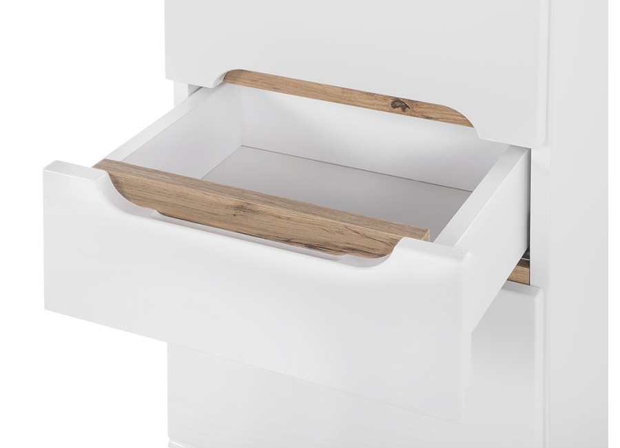 Vyrobená je z laminovanej drevotriesky s ABS hranami, ktoré zaručujú odolnosť voči vlhkosti. Dvierka z MDF materiálu sú ozdobené jemným vodorovným pásikom. Zafrézovaná úchytka je praktická, dopĺňa minimalistický dizajn skrinky. Farebné prevedenie v kombinácii bielej matnej, dub wotan a bieleho lesku prináša do priestoru sviežosť a moderný vzhľad. Skrinka je umiestnená na nožičkách. Jednou z hlavných funkcií je tiché dovieranie dvierok a zásuvky, ktoré zabezpečuje komfortné a diskrétne používanie.