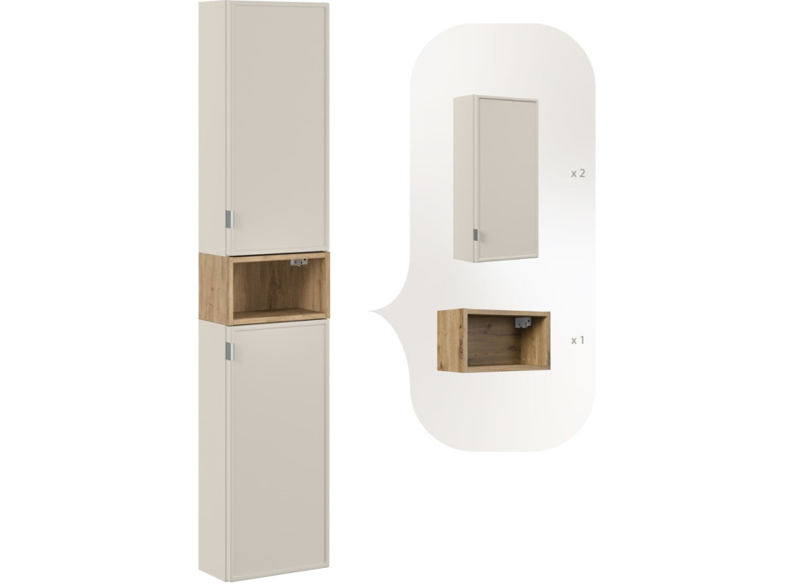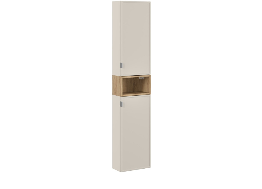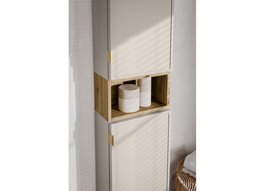 Vysoká policová skrinka do kúpeľne BELLA Cashmere je ideálnym doplnkom do modernej kúpeľne. Kúpeľňová skrinka poskytuje dostatok úložného priestoru v šírke 35 cm, čo umožňuje efektívne usporiadanie všetkých potrebných vecí, napr. uterákov alebo kozmetiky. Vyrobená je z laminovanej drevotriesky s ABS hranami, zatiaľ čo dvierka sú z MDF materiálu, ktorý zvyšuje odolnosť voči vlhkosti. Dvierka sú zdobené jemným frézovaným rámom, ktorý pridáva nábytku elegantný nádych.