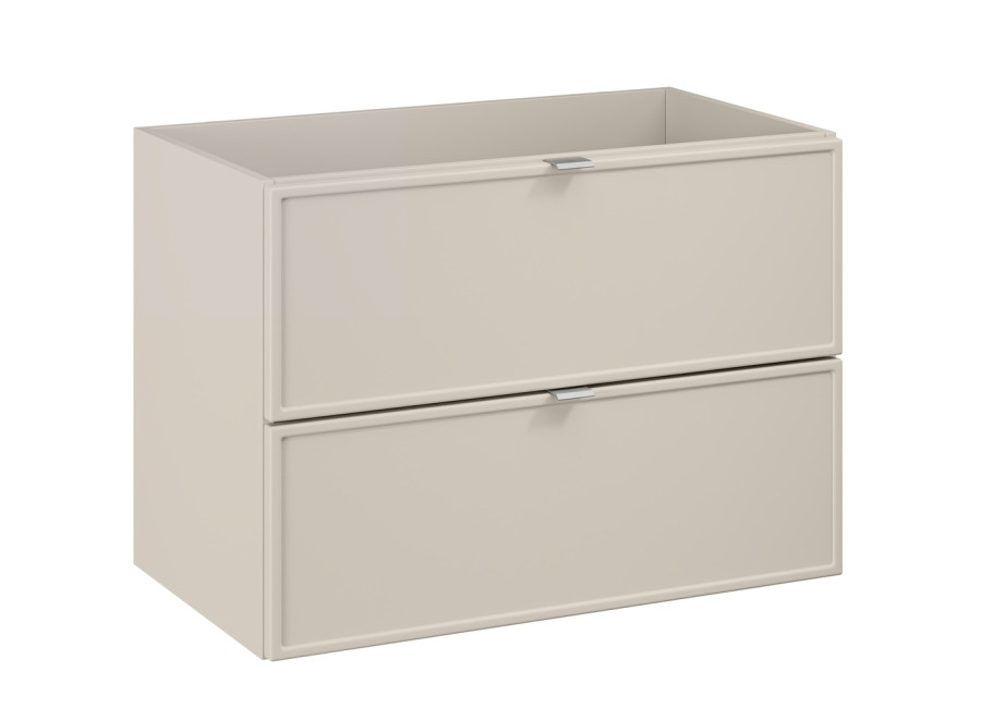 Výhodou tejto skrinky je možnosť výberu z troch farebných sád úchytiek: zlatá lesklá, chrómová lesklá a čierna matná. To umožňuje zladiť skrinku s ostatnými prvkami kúpeľne, napr. s batériou. Farebné prevedenie kašmír pôsobí príjemne a moderne. Závesná montáž skrinku dvíha zo zeme, čím uľahčuje údržbu podlahy a opticky zväčšuje priestor. Dve zásuvky s tichým dovieraním zaručujú pohodlné používanie. Horná zásuvka je ideálna na uloženie menších kúpeľňových doplnkov, zatiaľ čo spodná môže poslúžiť na väčšie predmety ako sú uteráky či čistiace prostriedky.