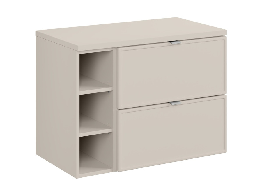 Závesná konštrukcia skrinky nielen uľahčuje čistenie podlahy, ale aj prispieva k pocitu väčšej priestornosti. Dve zásuvky sú vybavené mechanizmom tichého zatvárania a zaručujú komfort pri každodennom používaní. Horná zásuvka je ideálna na uskladnenie menších kúpeľňových potrieb, zatiaľ čo spodná poslúži na väčšie predmety, ako sú uteráky a čistiace prostriedky. Odporúčame zakúpiť plochý sifón, aby ste plne využili úložný priestor hornej zásuvky. Ku skrinke je potrebné zakúpiť vrchné umývadlo.