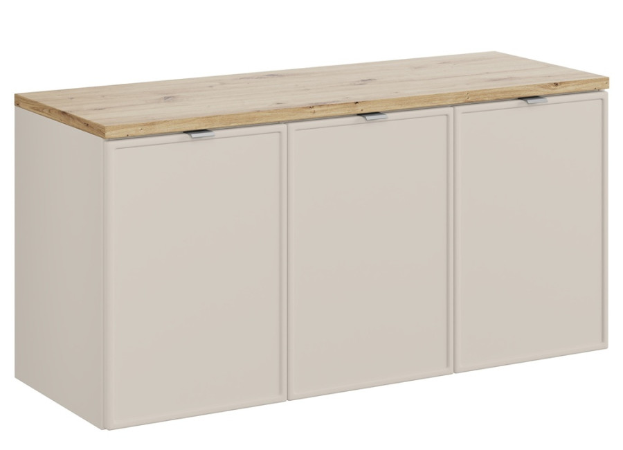 Skrinka pod umývadlo s vrchnou doskou BELLA Cashmere 82-120-3D-DA je skvelou voľbou pre tých, ktorí hľadajú funkčný a štýlový kúpeľňový nábytok. So šírkou 120 cm poskytuje dostatok priestoru na uskladnenie. Vyrobená je z laminovanej drevotriesky s ABS hranami, ktoré zvyšujú jej odolnosť voči vlhkosti. Dvierka z MDF materiálu dodávajú skrinkám do kúpeľne pevnosť a uhladený vzhľad, podporený ozdobne frézovaným rámom na predných plochách. Skrinka ponúka možnosť výberu z troch farebných sád úchytiek: zlatá lesklá, chrómová lesklá a čierna matná, čo prináša možnosť prispôsobiť jej vzhľad k batérii alebo iným doplnkom. Farebné prevedenie kašmír/dub artisan vytvára moderný dojem, vhodný do rôznych typov interiérov.