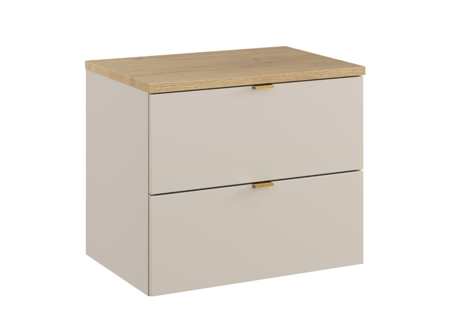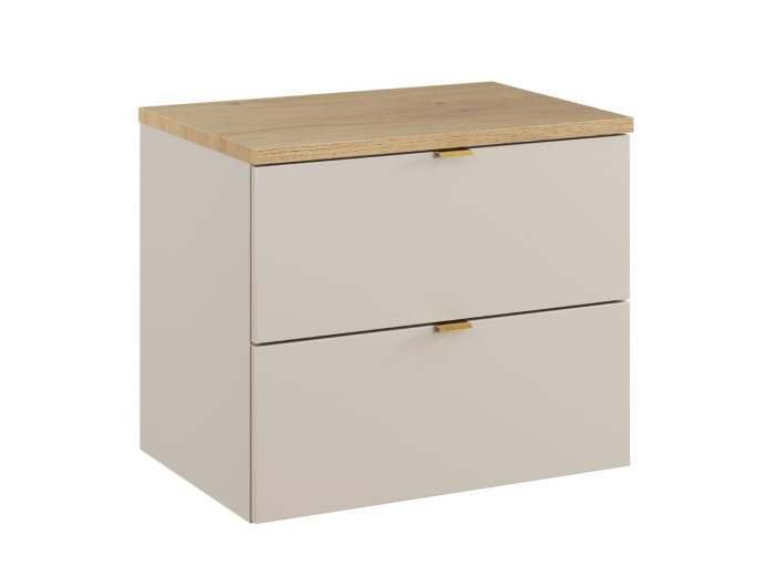 Skrinka pod umývadlo s vrchnou doskou DALIA Cashmere 82-60-46-2S-DCR je elegantným zástupcom moderného kúpeľňového nábytku. Štýlová kúpeľňová skrinka ponúka jednoduchý vzhľad vďaka hladkým predným plochám a jemnému farebnému prevedeniu kašmír/dub cremona. Je navrhnutá s dôrazom na praktickosť, pričom dokonale zapadne do akéhokoľvek kúpeľňového interiéru. Skrinka pod umývadlo v šírke 60 cm je ideálnou voľbou pre menšie aj väčšie kúpeľne. Vyrobená je z kvalitnej laminovanej drevotriesky s ABS hranami, ktoré zvyšujú jej odolnosť voči vlhkosti. Dve zásuvky sú vybavené funkciou tichého zatvárania, ktoré umožňujú pohodlné používanie. Vnútro zásuviek v sivej farbe ponúka dostatok úložného priestoru pre vaše kúpeľňové potreby, ako sú napríklad uteráky, hygienické potreby či kozmetiku.