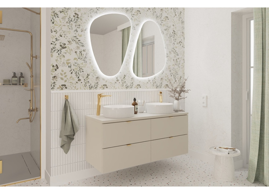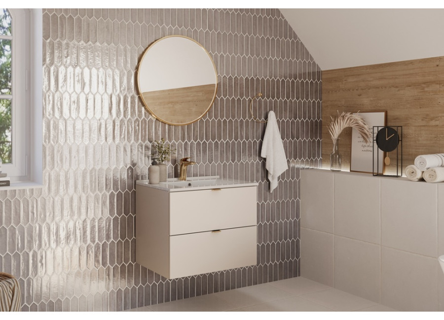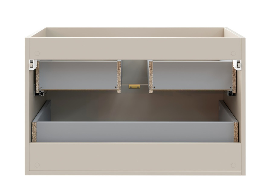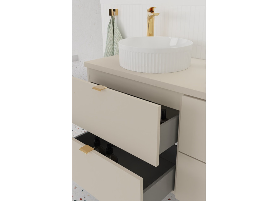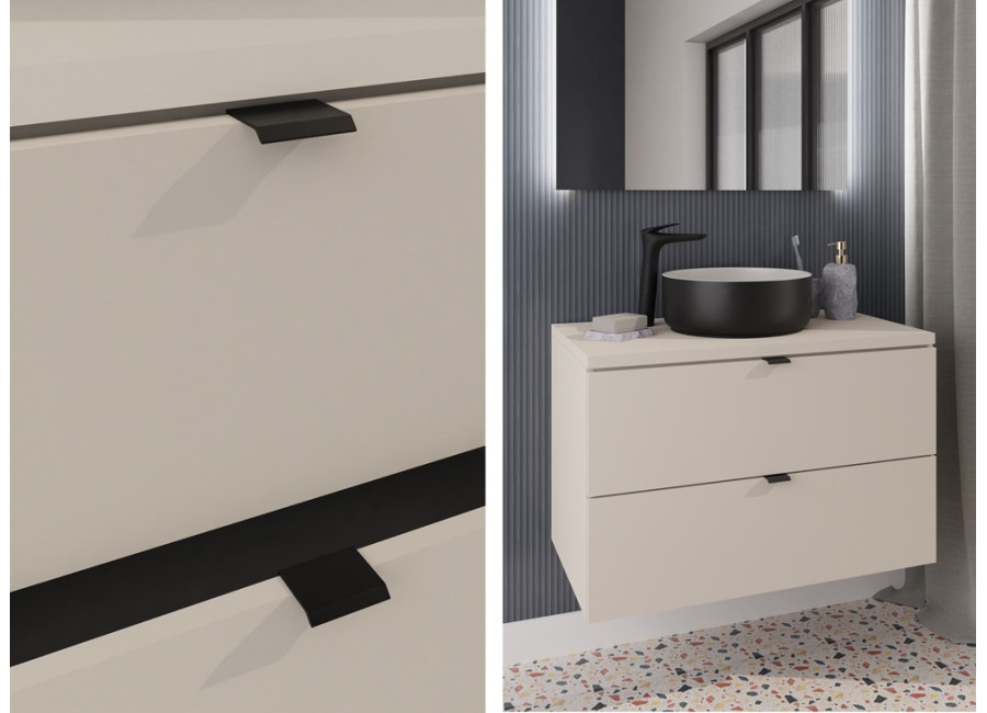 Súčasťou balenia sú 3 farebné sady úchytiek: zlatá lesklá, chrómová lesklá a čierna matná, ktoré môžete ľahko zladiť s kúpeľňovými batériami alebo inými doplnkami. Farebné prevedenie kašmír vnesie do vašej kúpeľne jemný a útulný tón. Ku skrinke odporúčame zakúpiť plochý sifón pre optimálne využitie priestoru. Vrchné umývadlo nie je zahrnuté v cene.