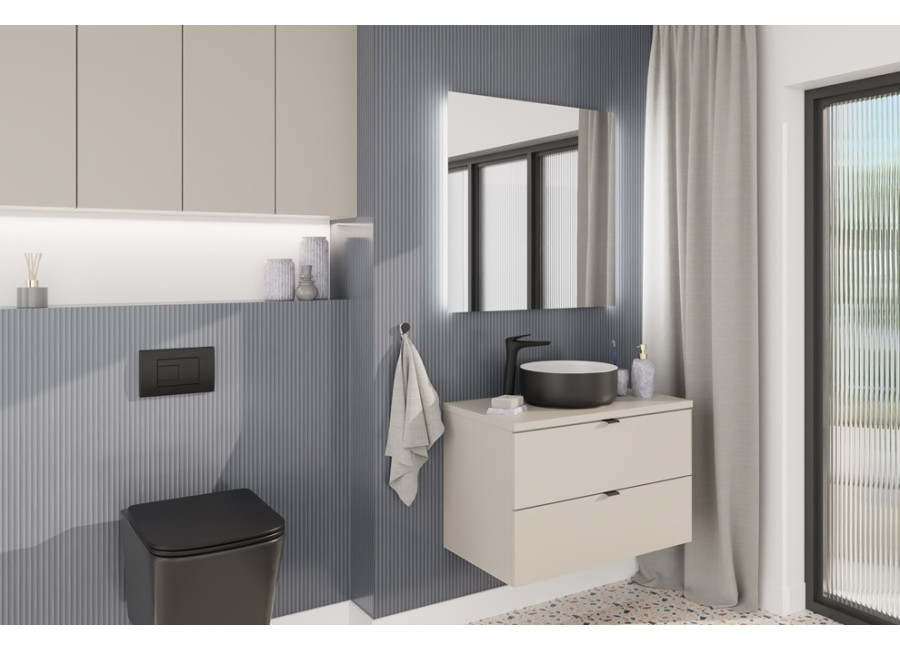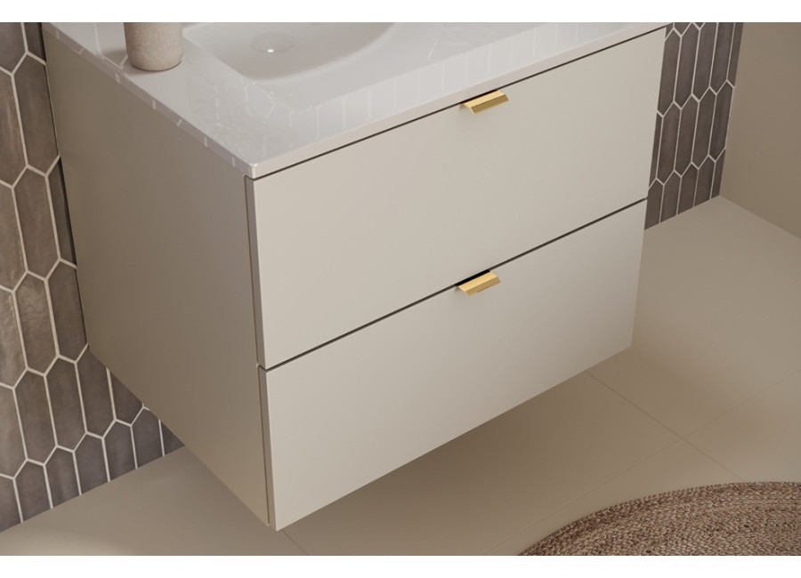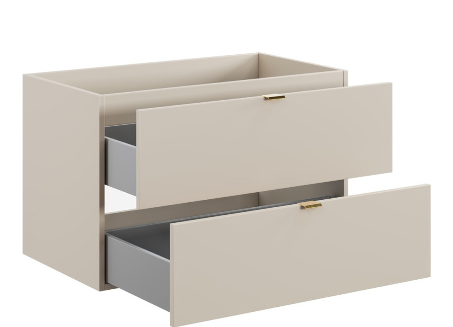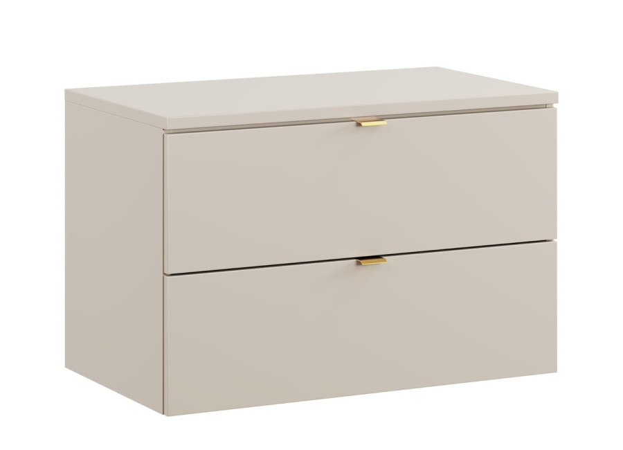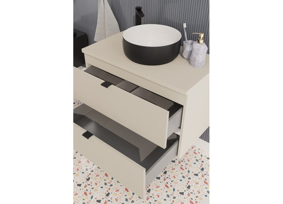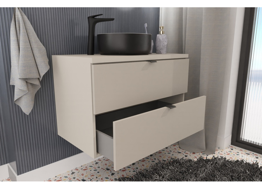 Skrinka pod umývadlo s vrchnou doskou DALIA Cashmere 82-80-46-2S-DC je kúpeľňová skrinka v šírke 80 cm. Vyrobená je z laminovanej drevotriesky s ABS hranami, ktoré zvyšujú jej odolnosť voči vlhkosti. Hladké predné plochy skrinky dodávajú minimalistický a čistý vzhľad. Dve praktické zásuvky s funkciou tichého zatvárania a sivým vnútrom poskytujú dostatok priestoru na uloženie vašich kúpeľňových potrieb, ako sú uteráky, kozmetika alebo čistiace prostriedky. Skrinka je závesná na stenu, čo uľahčuje údržbu podlahy a dodáva priestoru moderný vzhľad.
