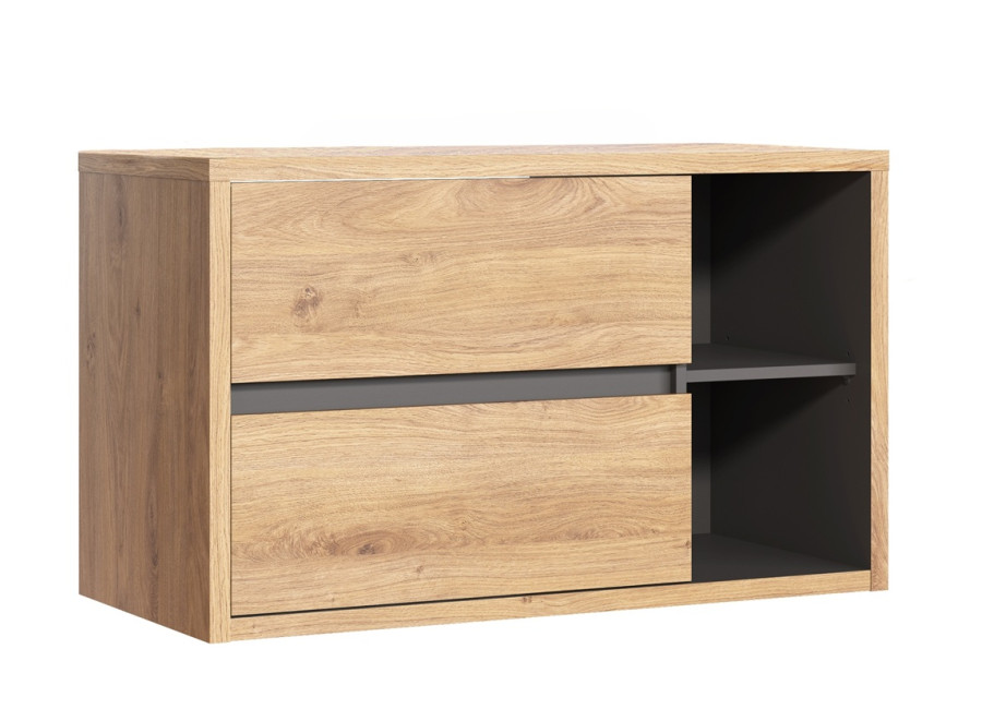 Skrinka pod umývadlo DEVON 823 v šírke 100 cm dokonale zapadne do každej modernej kúpeľne. Vyrobená je z laminovanej drevotriesky s ABS hranami, ktoré zvyšujú jej odolnosť voči vlhkosti. Hladké predné plochy a bezúchytkové otváranie pridávajú skrinke elegantný a čistý vzhľad, zatiaľ čo farebné prevedenie dub shetland/grafit dodáva priestoru teplý a prirodzený nádych. Skrinka je závesná na stenu, čím nielen šetrí miesto, ale aj uľahčuje údržbu podlahy v kúpeľni.