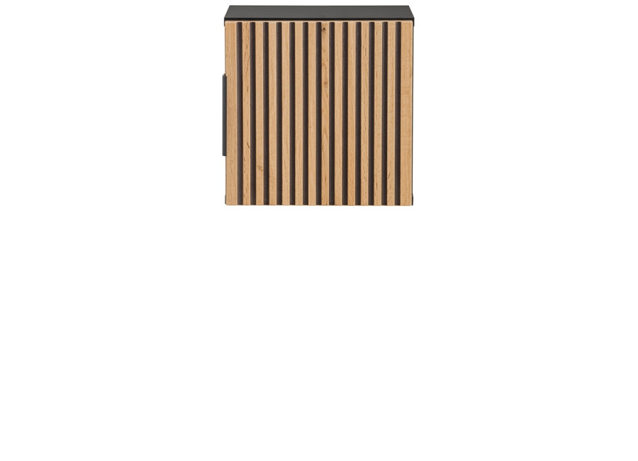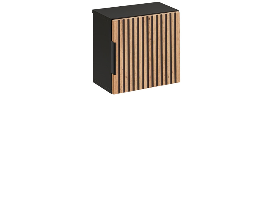 Vyrobená je z laminovanej drevotriesky s ABS hranami, ktoré zvyšujú odolnosť voči vlhkosti. Dvierka z MDF materiálu sú zdobené zvislými čiernymi drážkami a doplnené čiernou úchytkou, čo pridáva na jej modernom vzhľade. Farebné prevedenie s čiernym matným korpusom a dvierkami vo farbe dub wotan vytvára elegantný kontrast. Ako závesná skrinka ponúka možnosť jednoduchého umiestnenia na stenu, čím šetrí podlahový priestor a zjednodušuje údržbu podlahy. Systém tichého dovierania dvierok zaisťuje užívateľský komfort.