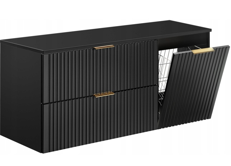 Súčasťou skrinky sú dve priestranné zásuvky a dvierka, ktoré sú vybavené systémom tichého dovierania. Veľkou výhodou je možnosť výberu z troch farebných sád úchytiek – čierna matná, lesklá zlatá a lesklá chrómová. Úchytky si tak môžete zladiť s kúpeľňovými batériami alebo ostatnými doplnkami. Skrinka pod umývadlo s košom na prádlo ponúka komfortné uloženie špinavého prádla, zásuvky využijete na hygienické potreby, čistiace prostriedky aj kozmetiku. Ku skrinke odporúčame objednať plochý sifón, ktorý umožní komfortné využitie hornej zásuvky v plnom rozsahu.