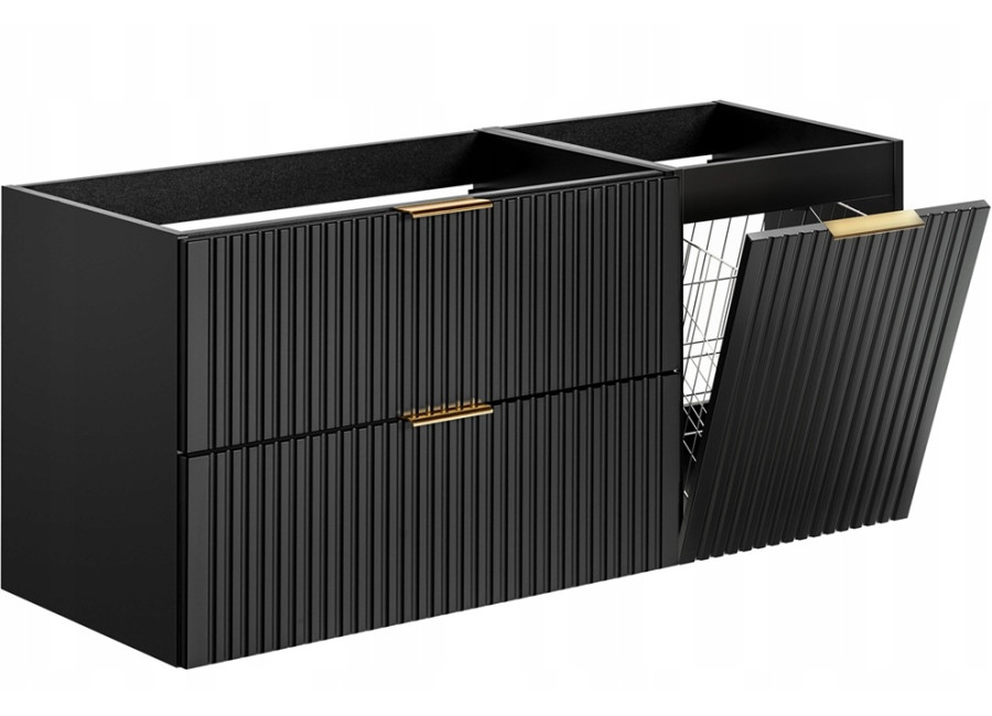 Skrinka pod umývadlo v šírke 120 cm z kolekcie čiernych kúpeľňových skriniek ADEL predstavuje funkčné riešenie pre každý moderný interiér kúpeľne. Kúpeľňová skrinka sa skladá z troch častí: