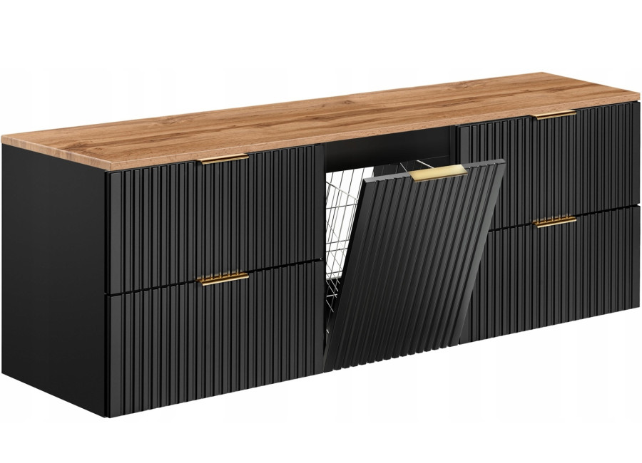 Ide o skrinku do kúpeľne určenú na zavesenie na stenu, čím uľahčí údržbu podlahy a zároveň pôsobí vzdušne. Na jej výrobu bola použitá laminovaná drevotrieska s ABS hranami. Predné plochy sú z MDF materiálu, čo zvyšuje ich odolnosť voči vlhkosti a každodennému používaniu. Predné časti zaujmú zvislým ozdobným drážkovaním, ktoré pridáva na elegancii. Farebné prevedenie kombinuje čiernu matnú s dekorom dub wotan, takže skrinka zapadne nielen medzi čierne kúpeľňové koncepty, ale aj do rozmanitých štýlov zariadenia.