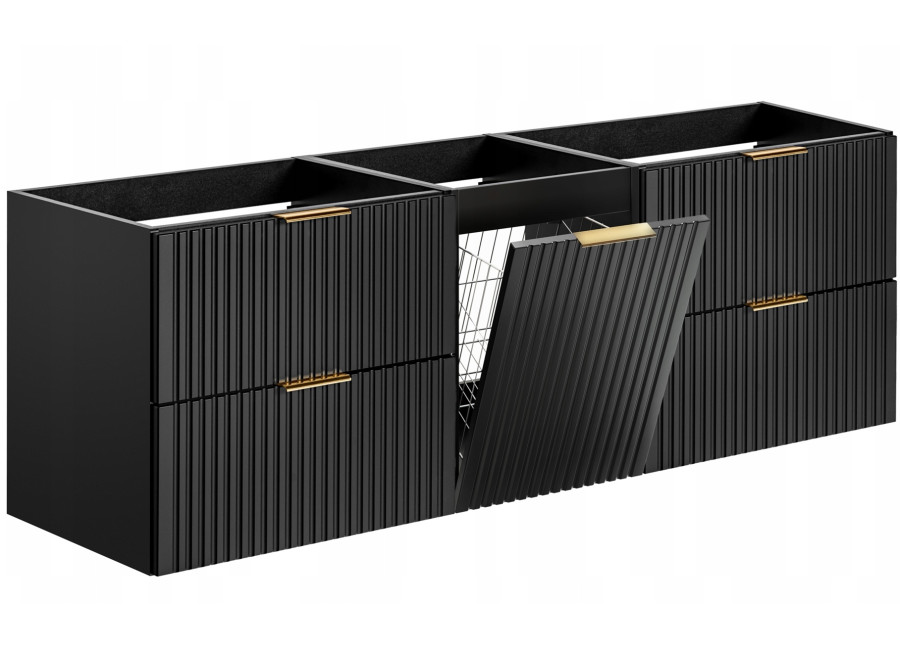 Skrinka pod umývadlo v šírke 160 cm z kolekcie čiernych kúpeľňových skriniek ADEL predstavuje funkčné riešenie pre každý moderný interiér kúpeľne. Kúpeľňová skrinka sa skladá zo štyroch častí:
