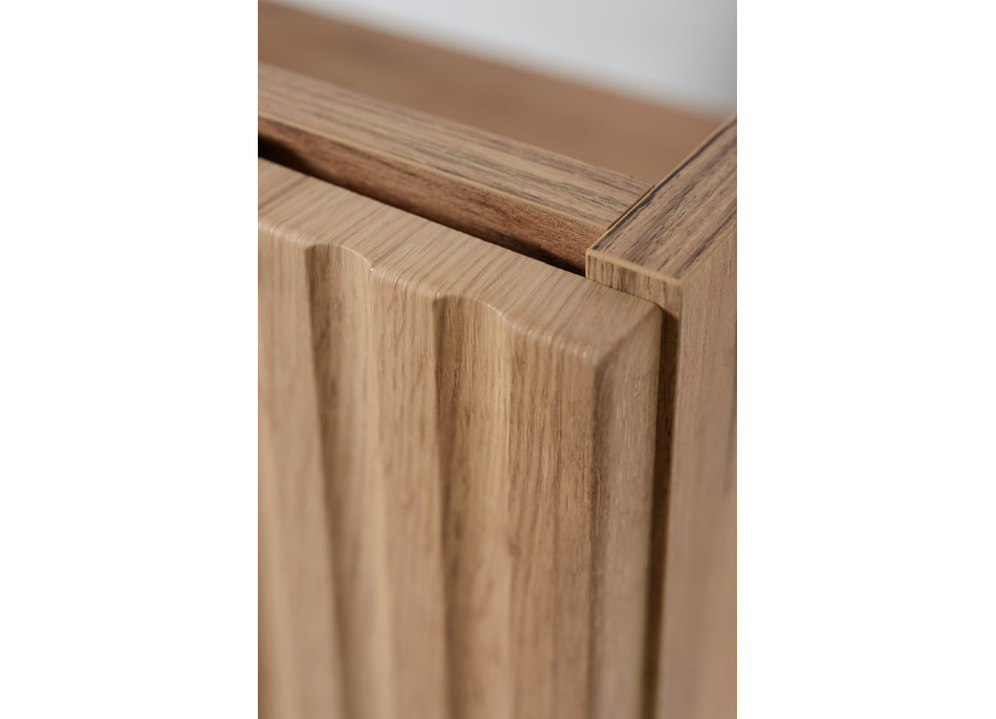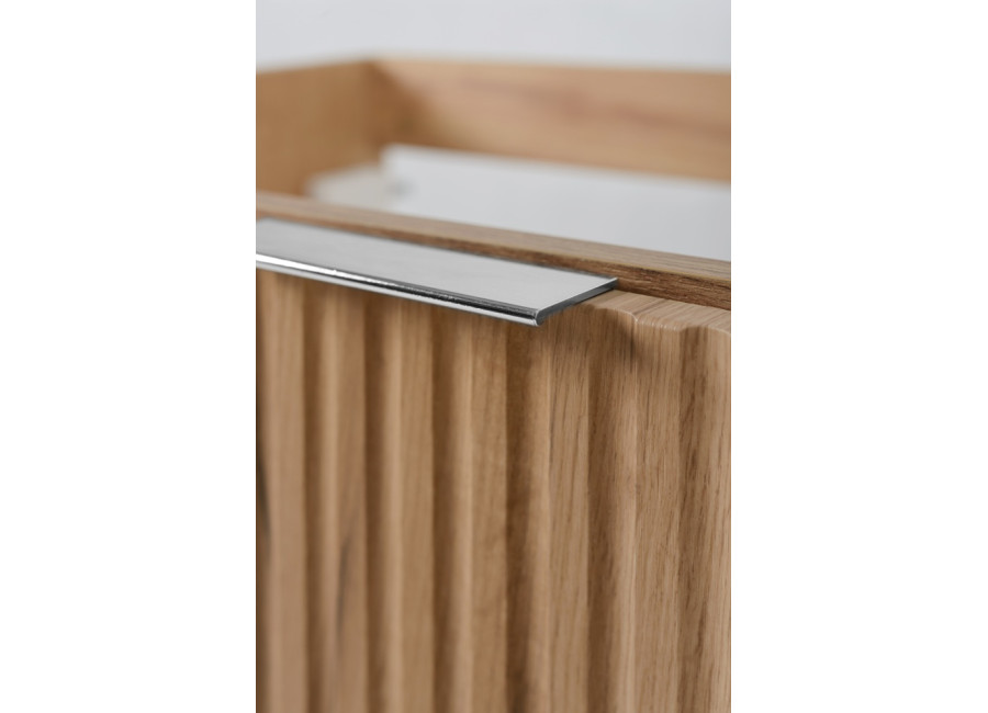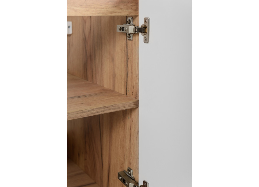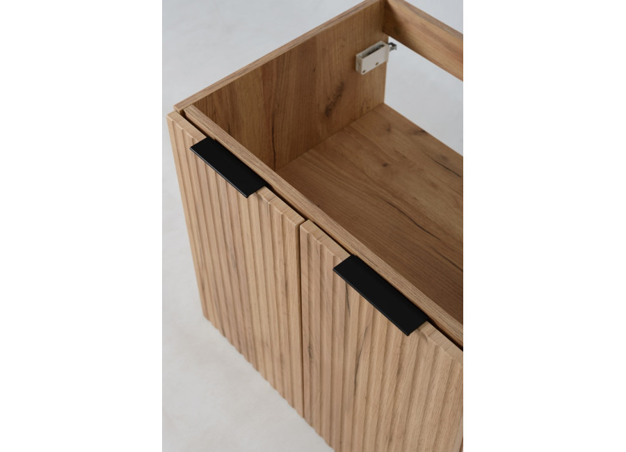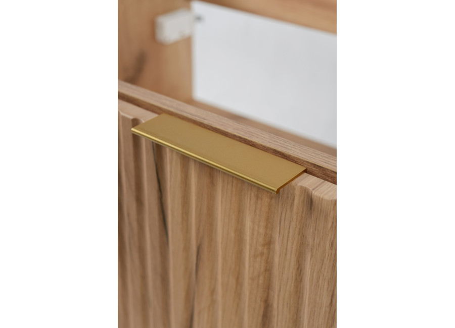 Dvierka so zvislým ozdobným frézovaním sú vybavené tichým dovieraním, ktoré znižuje hluk pri používaní. V balení nájdete tri sady úchytiek – čiernu matnú, lesklú zlatú a lesklú chrómovú, aby ste ich mohli zladiť s batériou alebo iným kúpeľňovými doplnkami. Skrinka je určená na zavesenie na stenu. Konštrukcia aj povrchová úprava zodpovedajú požiadavkám na kvalitné, voči vlhkosti odolné kúpeľňové skrinky.