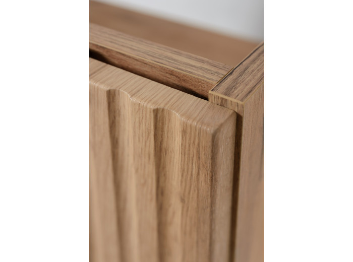 Dvierka so zvislým ozdobným frézovaním sú vybavené tichým dovieraním, ktoré znižuje hluk pri používaní. V balení nájdete tri sady úchytiek – čiernu matnú, lesklú zlatú a lesklú chrómovú, aby ste ich mohli zladiť s batériou alebo iným kúpeľňovými doplnkami. Skrinka je určená na zavesenie na stenu. Konštrukcia aj povrchová úprava zodpovedajú požiadavkám na kvalitné, voči vlhkosti odolné kúpeľňové skrinky.