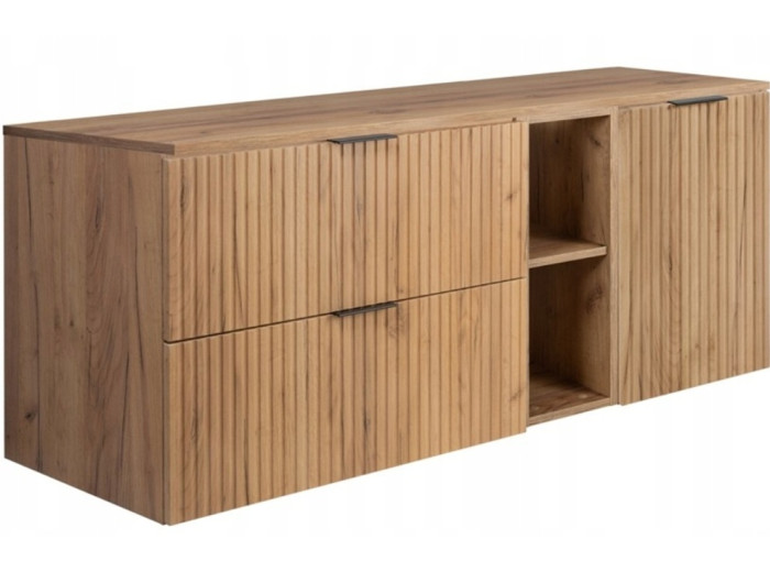 Je vyrobená z laminovanej drevotriesky s ABS hranami, predné plochy tvoria MDF materiály, ktorým nadčasový vzhľad dodáva zvislé drážkovanie. Skrinka je závesná na stenu, čím zabezpečí voľnú podlahu a jednoduchšiu údržbu priestoru. V balení sú tri sady úchytiek (čierna matná, lesklá zlatá a lesklá chrómová), ktoré si môžete zladiť s batériou alebo doplnkami v kúpeľni, čím dotvoríte celkový vzhľad. Zásuvky aj dvierka sú vybavené funkciou tichého zatvárania.