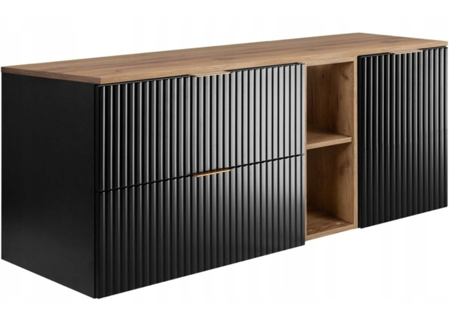 Je vyrobená z laminovanej drevotriesky s ABS hranami, predné plochy z MDF materiálu, pričom sú zdobené zvislým drážkovaním. Farebné prevedenie čierna matná + dub wotan pôsobí vyvážene a moderne. Kúpeľňová skrinka je závesná na stenu, dvierka a zásuvky sú vybavené funkciou tichého zatvárania.