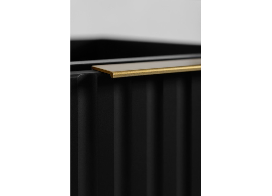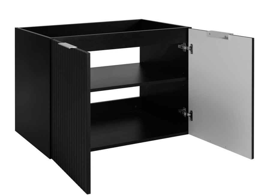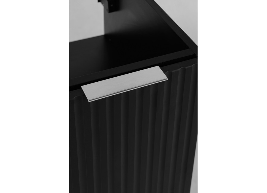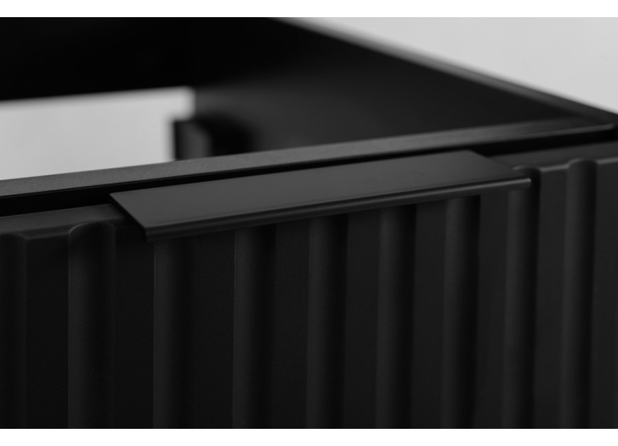 Je vyrobená z laminovanej drevotriesky s ABS hranami, predné plochy z MDF materiálu, pričom sú zdobené zvislým drážkovaním. Farebné prevedenie čierna matná + dub craft zlatý pôsobí vyvážene a moderne. Kúpeľňová skrinka je závesná na stenu, dvierka a zásuvky sú vybavené funkciou tichého zatvárania.