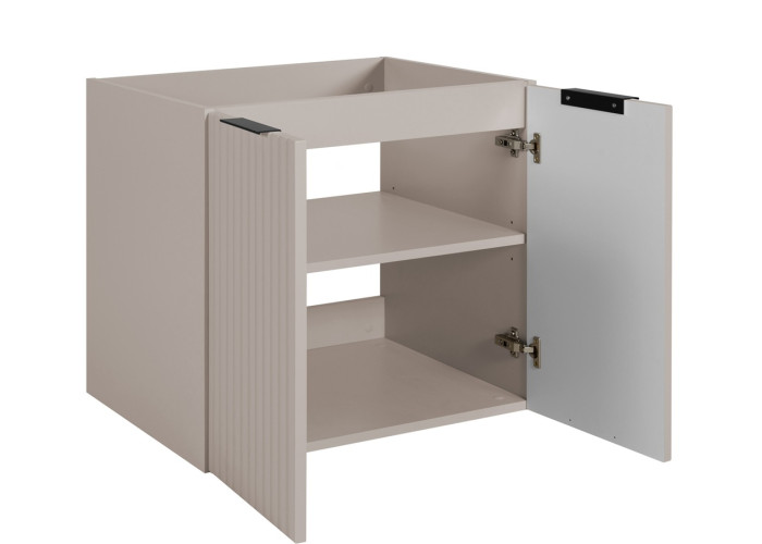 Skrinka pod umývadlo FLOW kašmír K60D2 patrí medzi béžové kúpeľňové skrinky, ktoré dokážu skĺbiť funkčnosť s elegantnými modernými líniami. Táto skrinka pod umývadlo v šírke 60 cm je vyrobená z laminovanej drevotriesky s ABS hranami, pričom predné plochy z MDF materiálu sú zdobené zvislým drážkovaním, čo celému nábytku dodáva moderný akcent. Farebné prevedenie kašmír zapadne do väčšiny kúpeľňových interiérov, kde sa hľadá béžový kúpeľňový nábytok s nadčasovým vzhľadom. Skrinka je závesná na stenu, čo uľahčuje údržbu podlahy a opticky odľahčuje priestor. Dvierka sú vybavené funkciou tichého zatvárania.