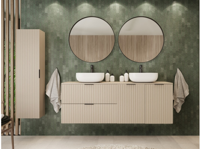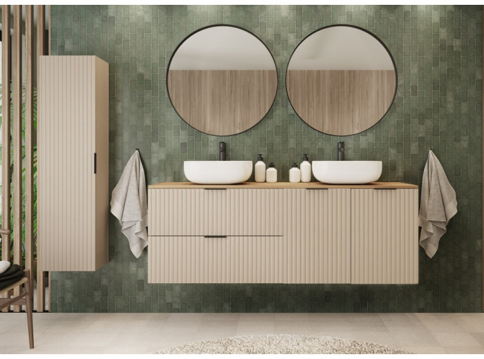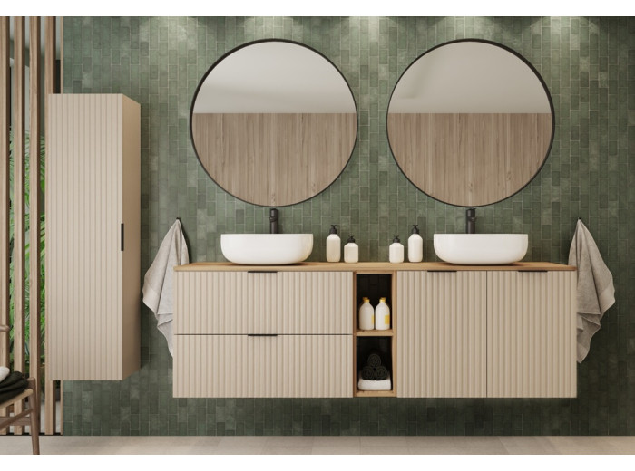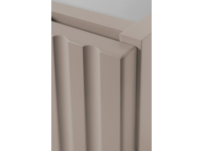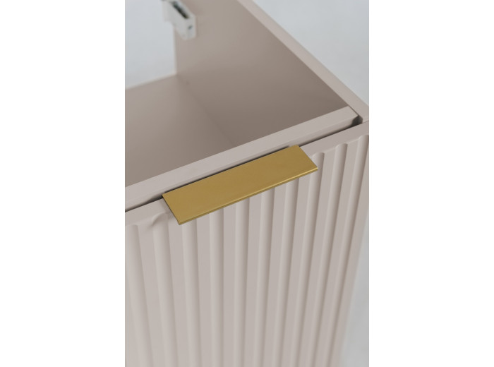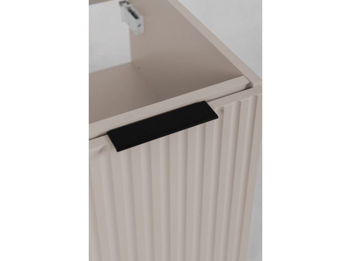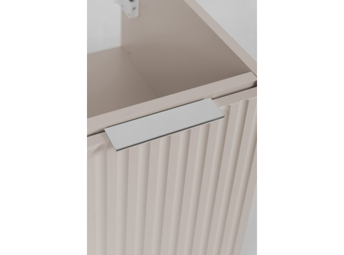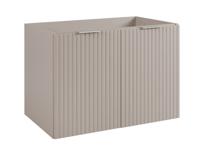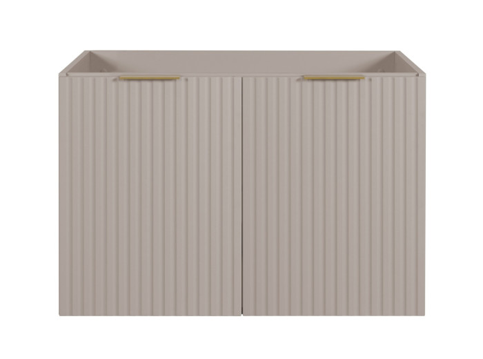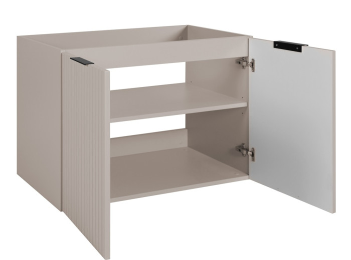 Skrinka pod umývadlo FLOW kašmír K80D2 patrí medzi béžové kúpeľňové skrinky, ktoré dokážu skĺbiť funkčnosť s elegantnými modernými líniami. Táto skrinka pod umývadlo v šírke 80 cm je vyrobená z laminovanej drevotriesky s ABS hranami, pričom predné plochy z MDF materiálu sú zdobené zvislým drážkovaním, čo celému nábytku dodáva moderný akcent. Farebné prevedenie kašmír zapadne do väčšiny kúpeľňových interiérov, kde sa hľadá béžový kúpeľňový nábytok s nadčasovým vzhľadom. Skrinka je závesná na stenu, čo uľahčuje údržbu podlahy a opticky odľahčuje priestor. Dvierka sú vybavené funkciou tichého zatvárania.