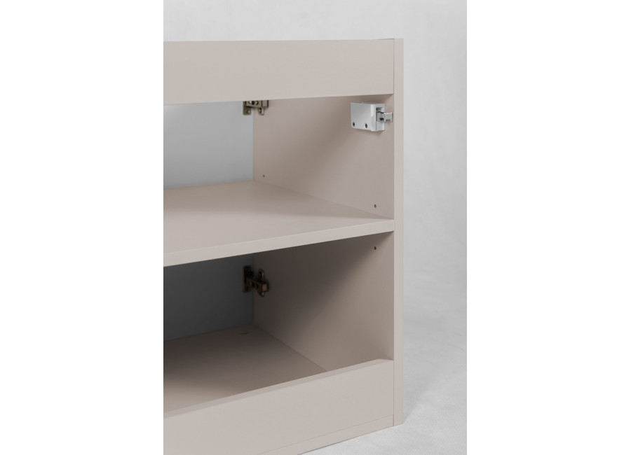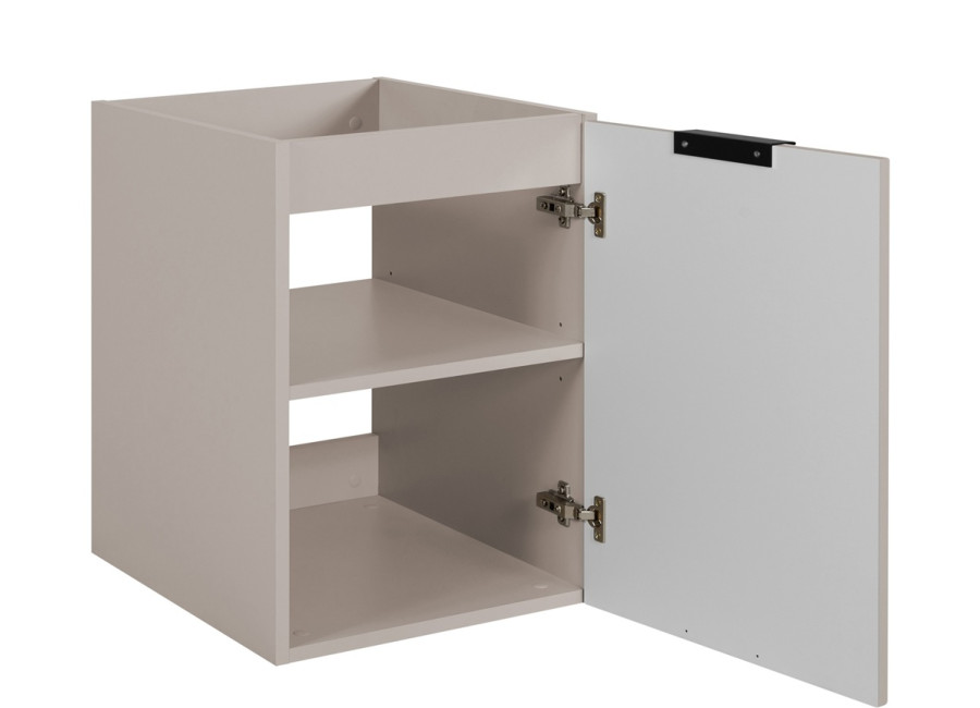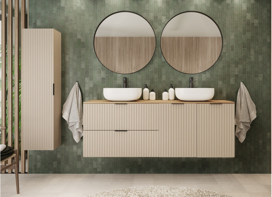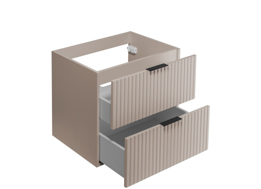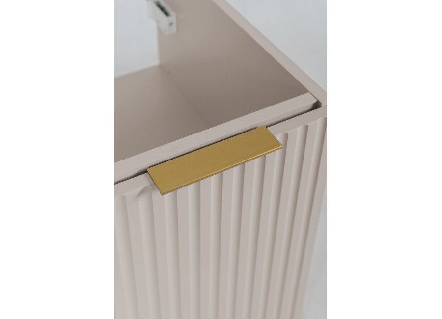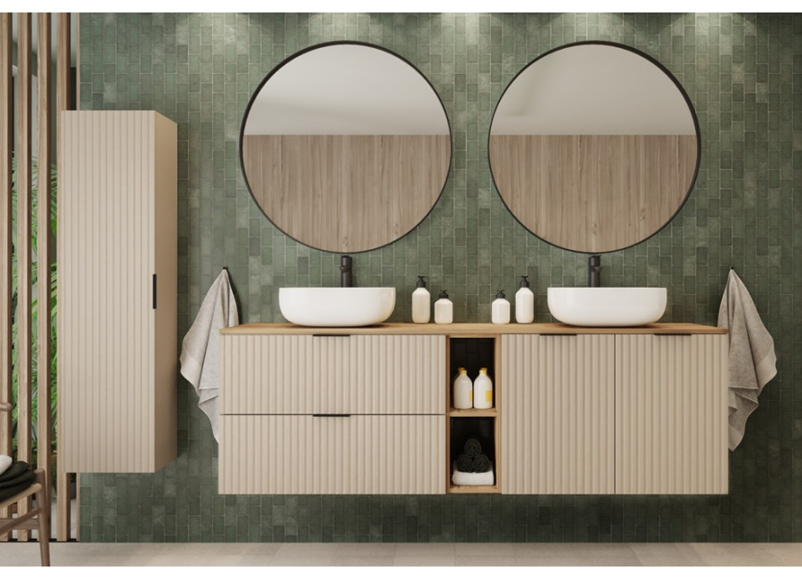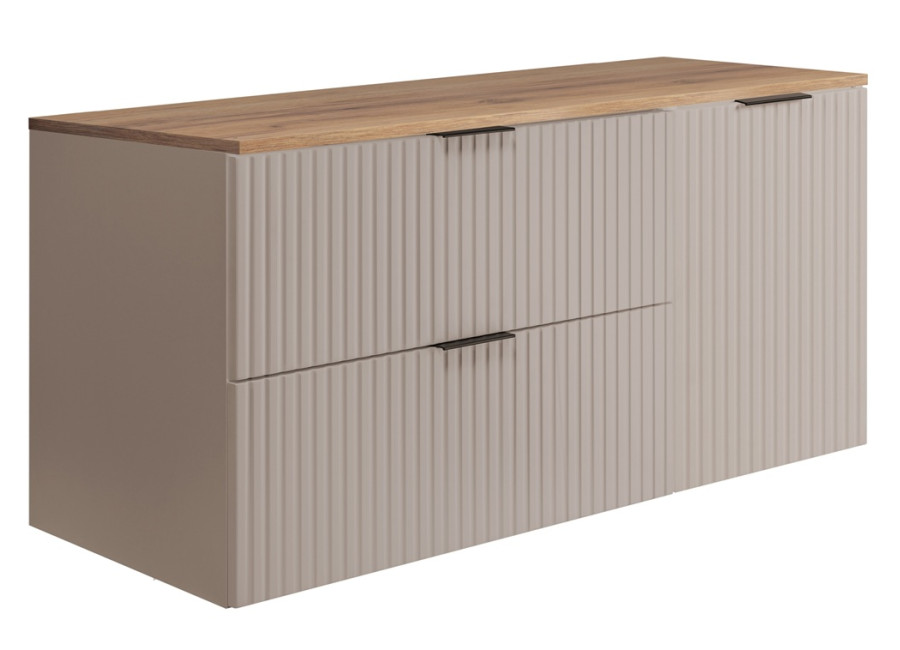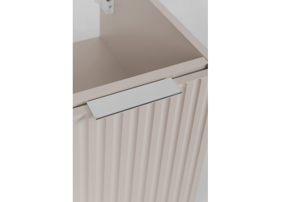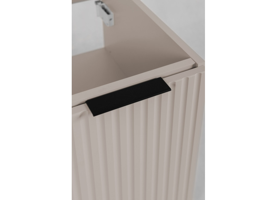 Kombinácia farebného prevedenia kašmír a dub craft zlatý dodáva tomuto béžovému kúpeľňovému nábytku teplý a harmonický vzhľad, ktorý dobre funguje v moderných aj klasických kúpeľniach. Korpus je vyrobený z laminovanej drevotriesky s ABS hranami, predné plochy z MDF materiálu sú zdobené zvislým drážkovaním. Skrinka je závesná na stenu a zásuvky a dvierka sú vybavené funkciou tichého zatvárania.