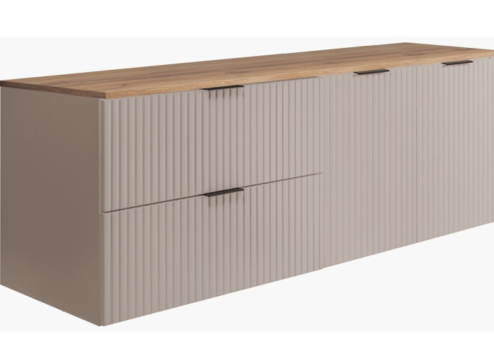 Farebné prevedenie kašmír spojené s teplým odtieňom dub craft zlatý vytvára prémiový béžový kúpeľňový nábytok, ktorý sa stane centrom pozornosti. Korpus je vyrobený z laminovanej drevotriesky s ABS hranami a predné plochy z MDF materiálu sú elegantne zdobené zvislým drážkovaním. Vďaka závesnému prevedeniu celá skrinka pôsobí ľahko a uľahčuje upratovanie podlahy.